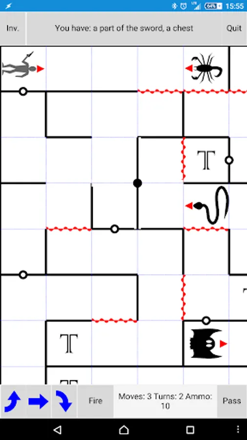 This is a solo boardgame, with simple rules: in the first level (more levels will come next) you must collect all the three parts of a sword, before you can go to the exit.