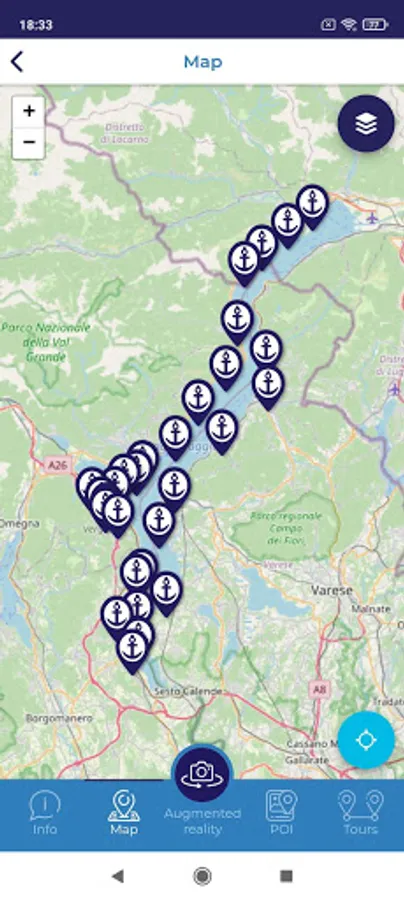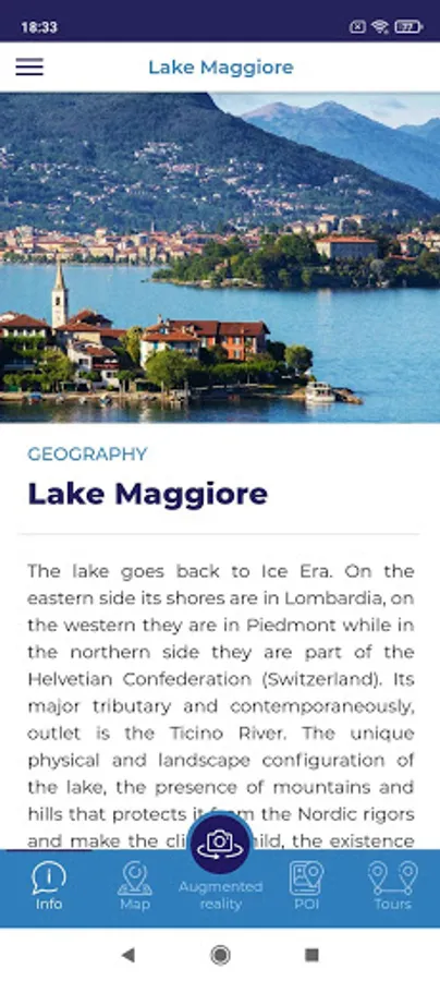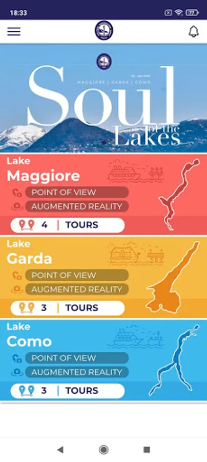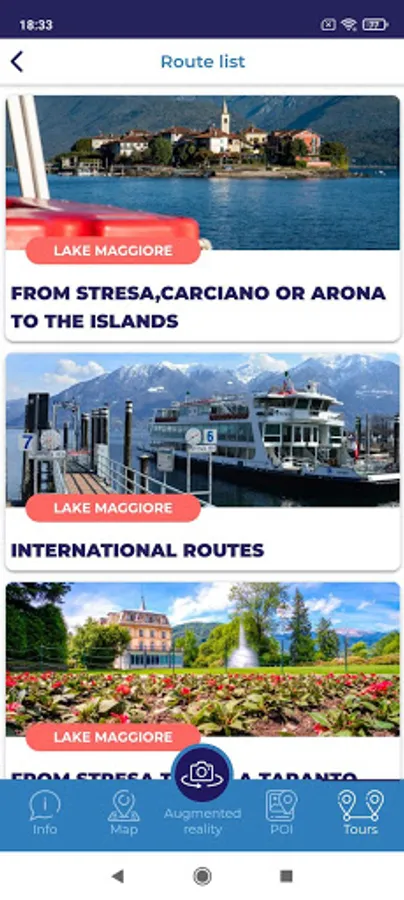 • Right below are three sections about the lakes Maggiore, Garda and Como set in three different colours: Points of Interest (POI), Augmented Reality and Routes;
