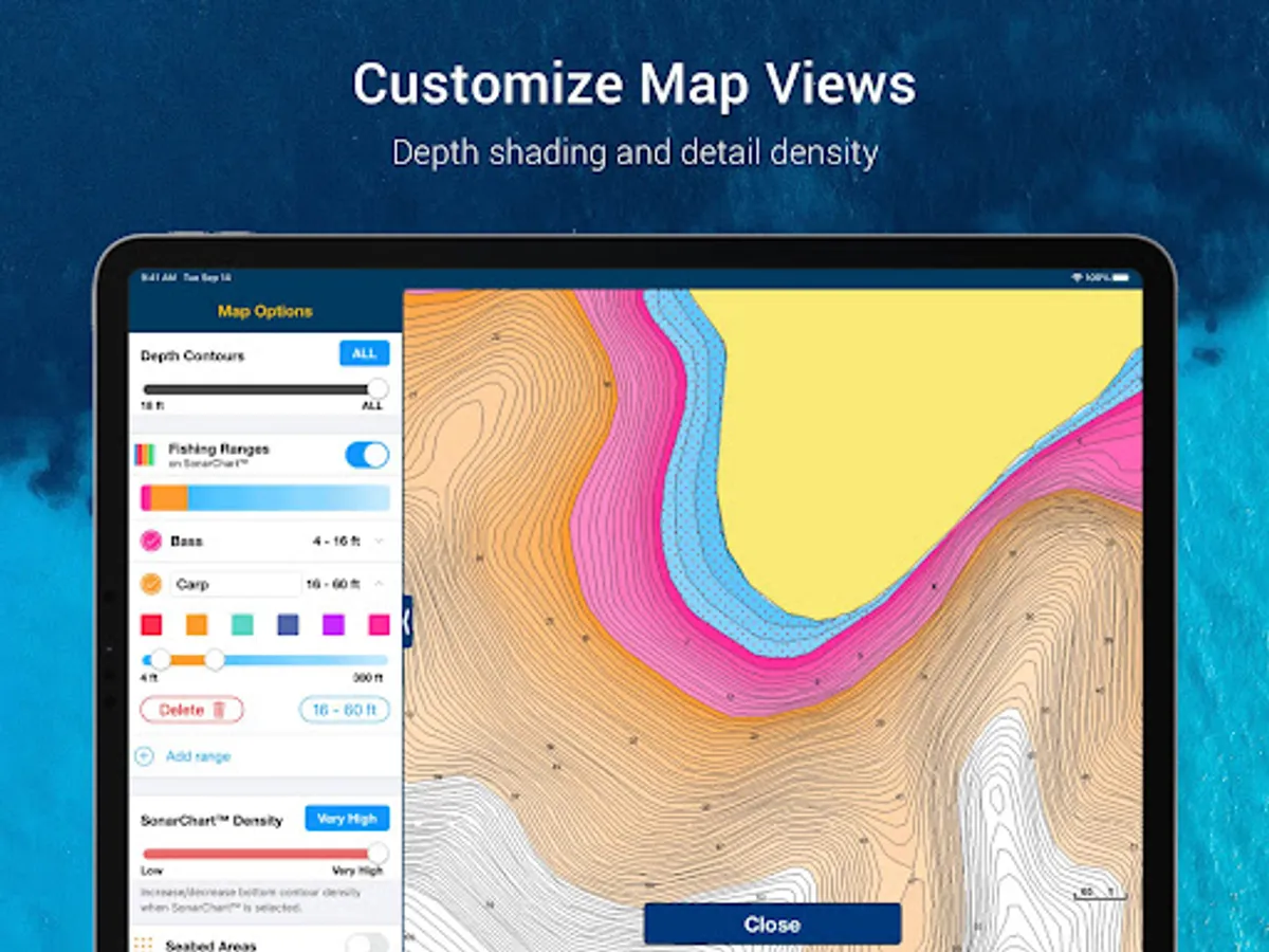 • MAP OPTIONS: Change chart-overlay combinations to customize chart views, highlight shallow areas, target multiple fishing ranges and more.