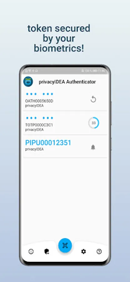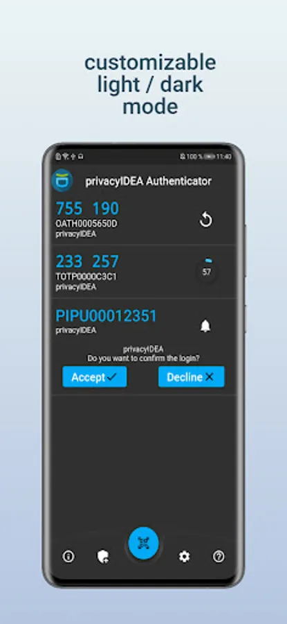 The Smartphone App "privacyIDEA Authenticator" turns your smartphone into an authentication device, which smoothlessly runs with the privacyIDEA backend. In contrast to classical smartphone based tokens the privacyIDEA Authenticator also allows for a more secure rollout process. In addition to HOTP and TOTP authentication the privacyIDEA Authenticator also support authentication via push notification.