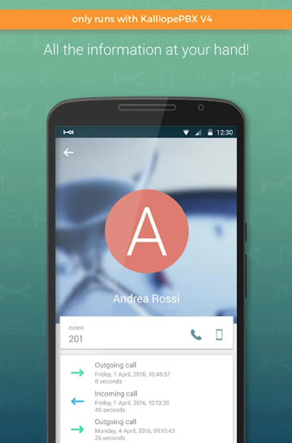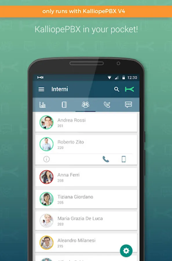 KCTI mobile app permits to access a subset of KalliopeCTI Pro functions: phonebooks and CDR, launch phone calls with click-to-call, answer a call directly from the mobile device, unconditional forward and much more.