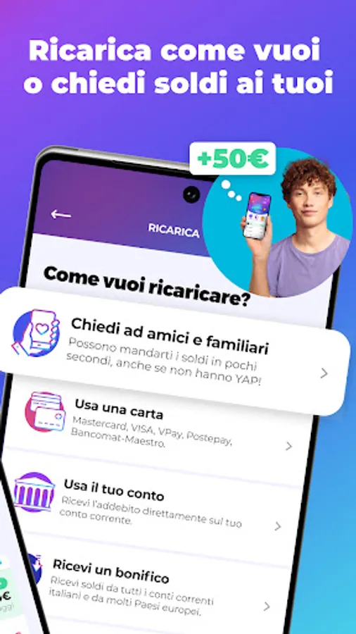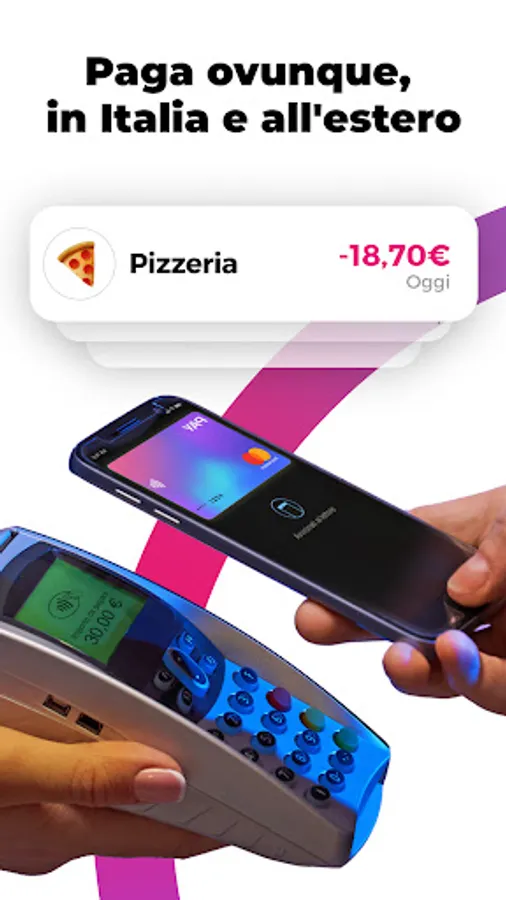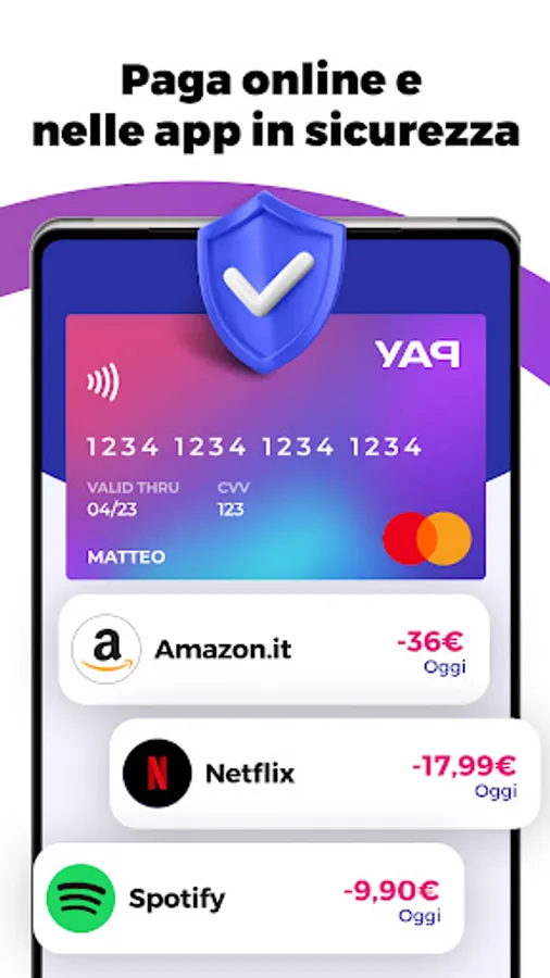 YAP is a Nexi Payments spa service, leader of digital payments in Italy. To join, you must be at least 12 years old, have an Italian telephone number, social security number and a valid identity document. To pay by phone, NFC must be enabled; the merchant must have a contactless POS. Alternatively, you can request the physical card (paid option).