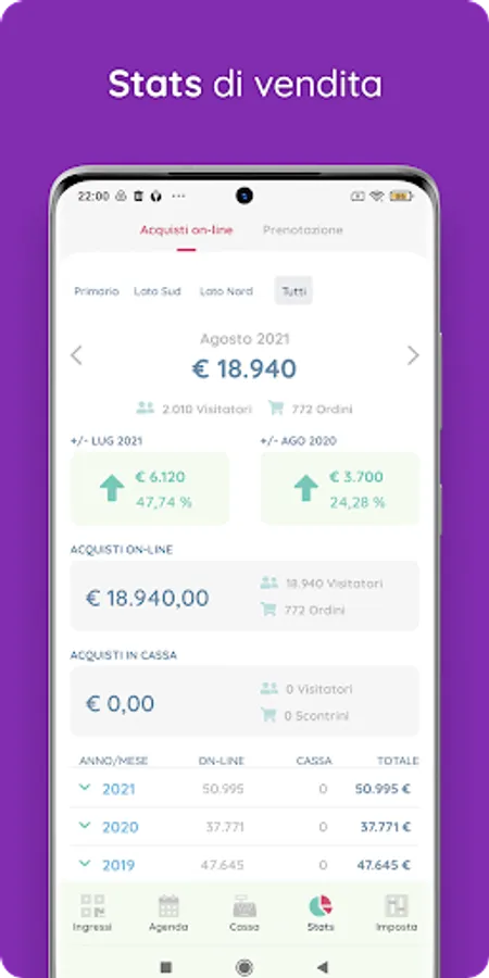 With the Stats function you have an instant summary of the purchases made in the current month and a comparison of the returns with respect to the previous month and year.