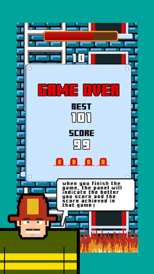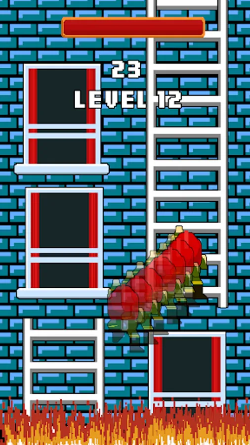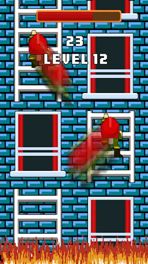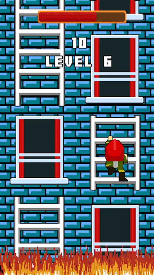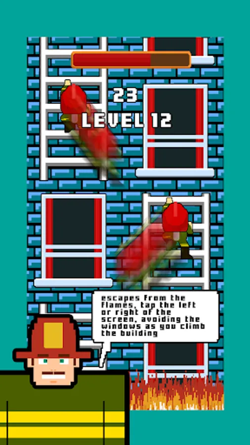 Become a Fireman, climb stairs and avoid the windows and the missing blocks.