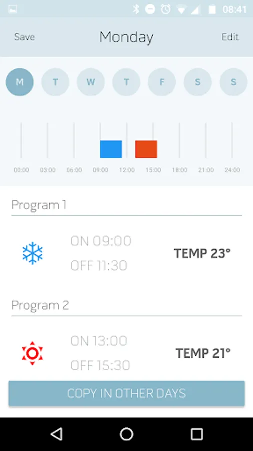 - Weekly timer with 2 daily time periods, with possibility of setting mode and set point for each period.