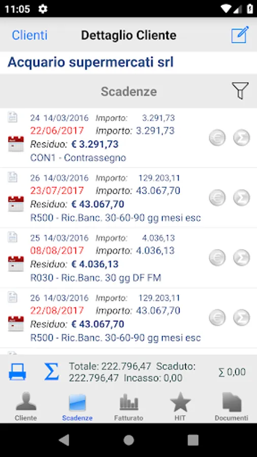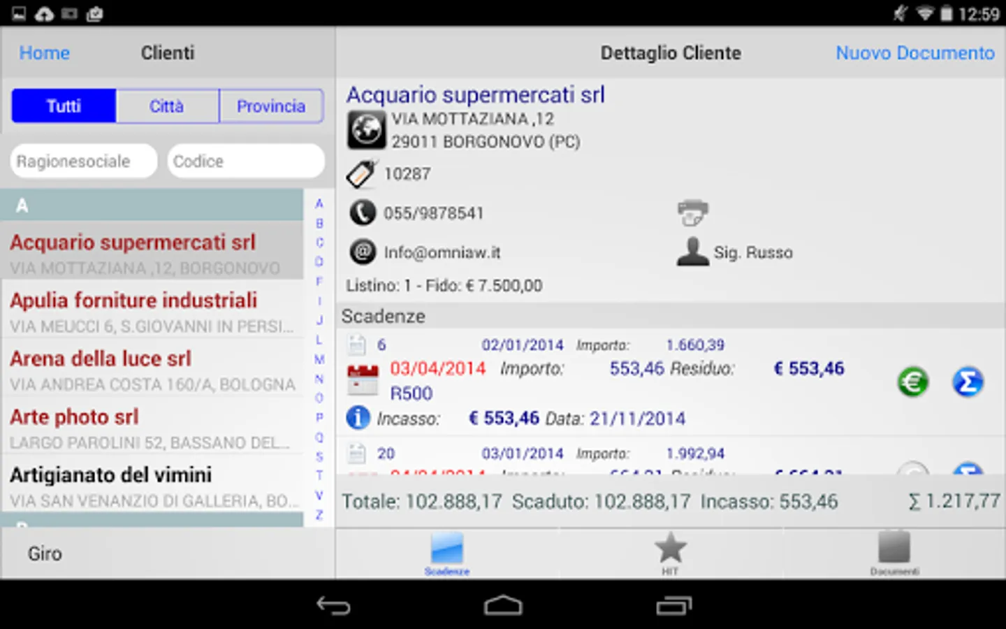 • Selecting a customer will display the personal data, contacts, the associated price list and the total number of documents issued, if any, and the open items;