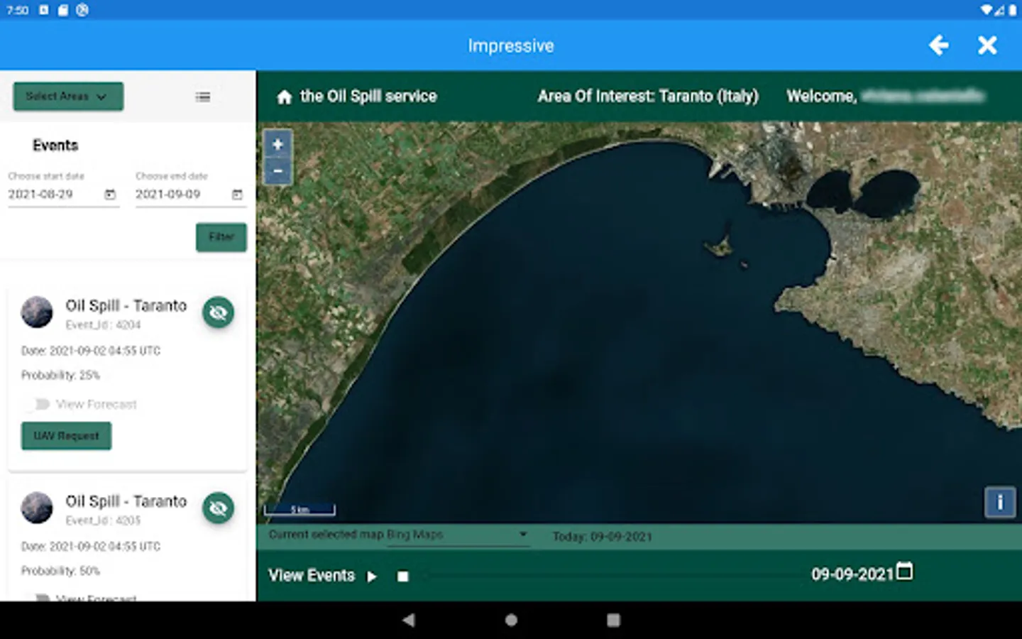 With Impressive App you can access to continuous monitoring of oil spill and waste water in Taranto, Rafina and La Luz Port areas.
