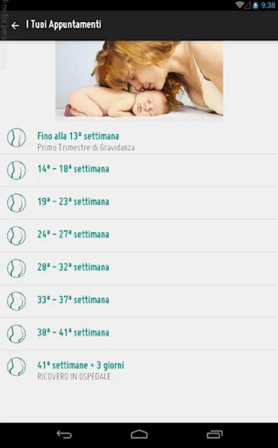 Within the application you can view and add in its agenda all the main events related to visits, tests and examinations to which the expectant woman has to undergo to bring forward, in a calm and controlled, her pregnancy.