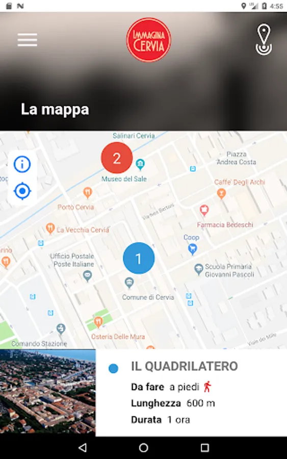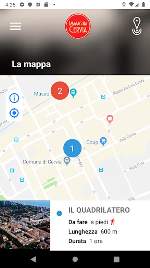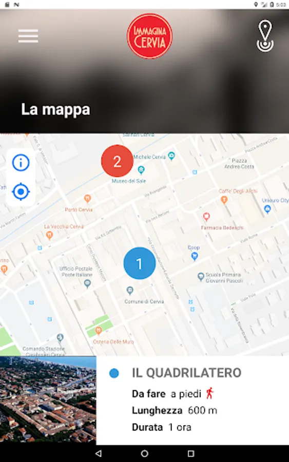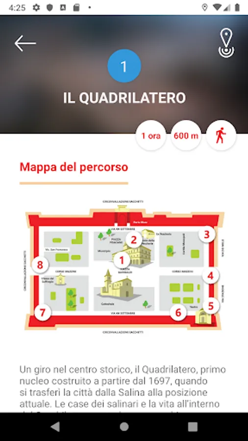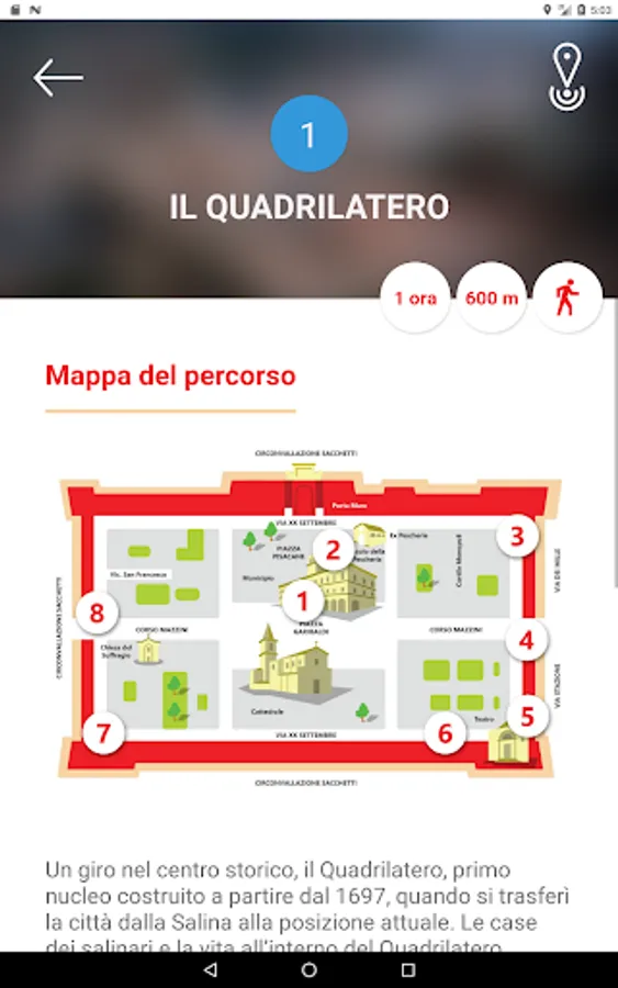 Within the application, the interactive city map shows different thematic routes. Once chosen the path from which to start, the app will indicate the points of interest, where it will be possible to receive a detailed description of the place, with images and multimedia contents.