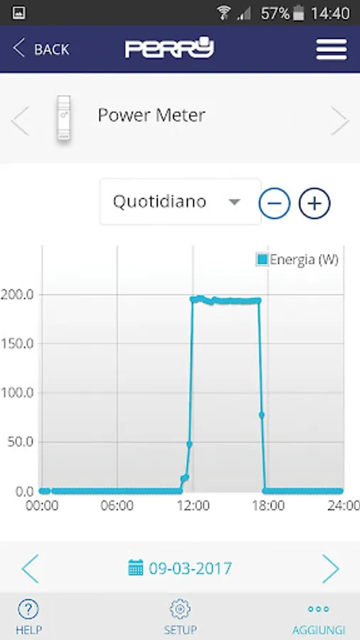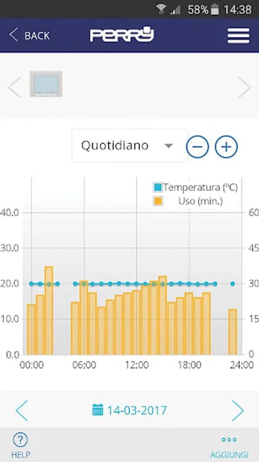PERRY CRONOTHERMOSTAT allows the setting of Perry timers read consumption, hours of operation, see the daily, monthly and yearly temperatures average, of each unit, on comfy charts.