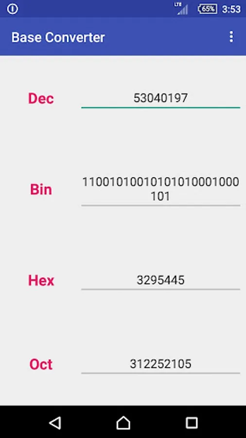 This app converts numbers from decimal numeral system to binary, hexadecimal, octal and vice versa. Accepted values are integers between 0 and 2^31-1 (base ten).