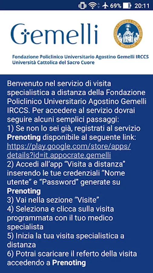 By downloading the VISPA app, you can make a remote visit with a specialist from the Gemelli Polyclinic Foundation - IRCCS. The remote specialist visit with our specialists reduces travel times, costs and inconvenience for patients and their families. The appointment is private and confidential; all phases of the transmission and collection of the patient's data are confidential and with respect for privacy.