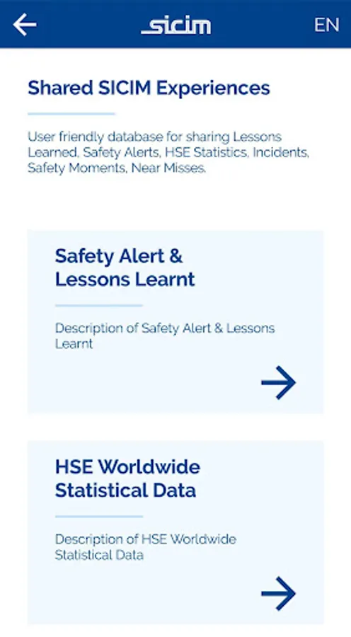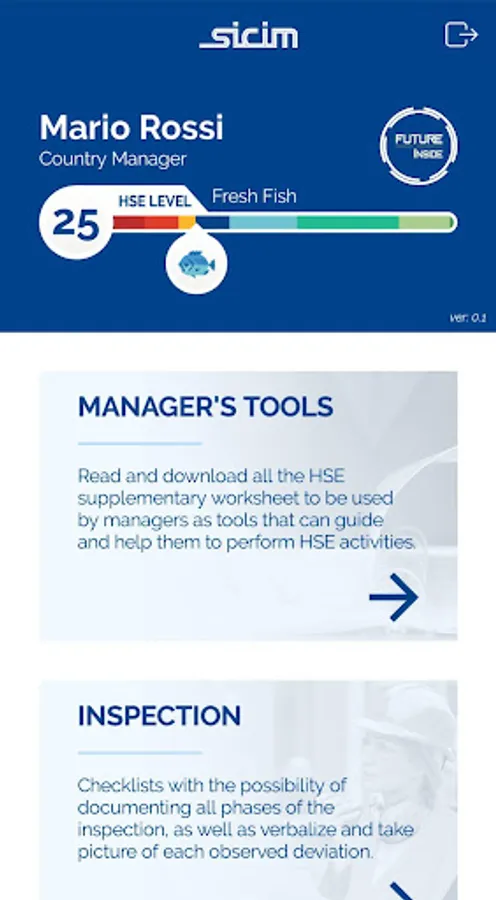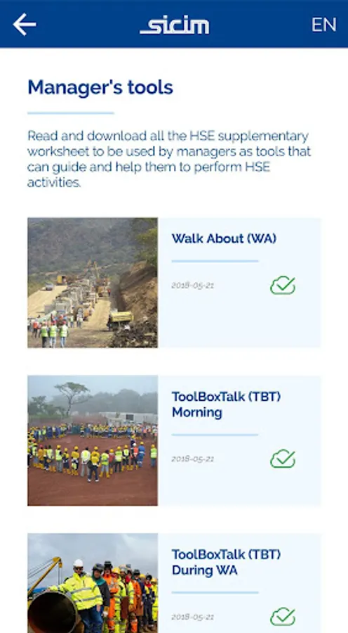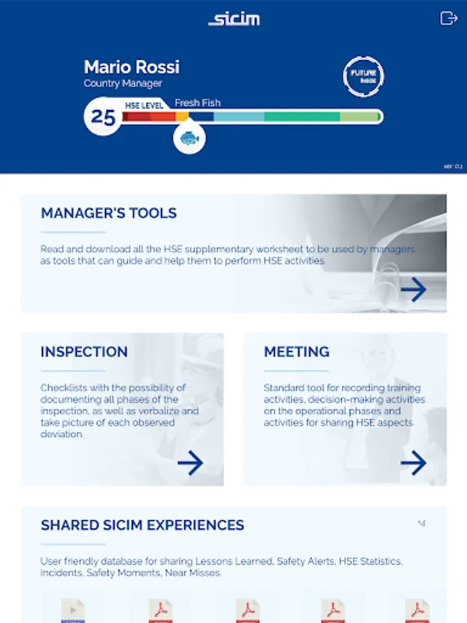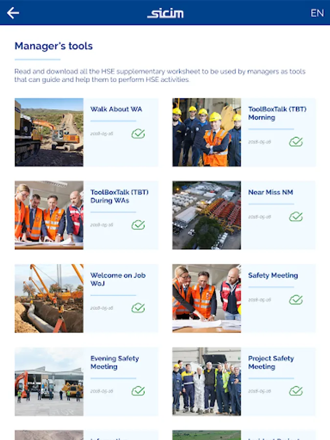 Its OffLine functionality allows direct and extensive use in remote areas workplaces typical for SICIM. The tool also has the purpose of motivating everyone to behaviours that are more suitable, more preventive and less toxic, with the aim of definitively decrease the number of accidents to people.