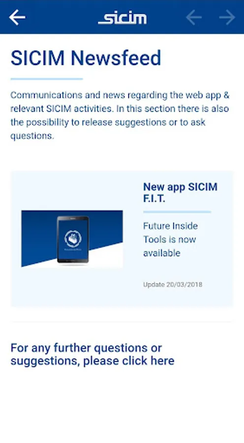 The SICIM FIT APP has been developed for SICIM’s employees and the acronym means Future Inside Tool. It aims to be an operational guide to be used in the workplace. It contains numerous and interesting supplementary worksheets to be used to carefully observe the rules to conduct a meeting, make an inspection or record significant changes in the workplace.