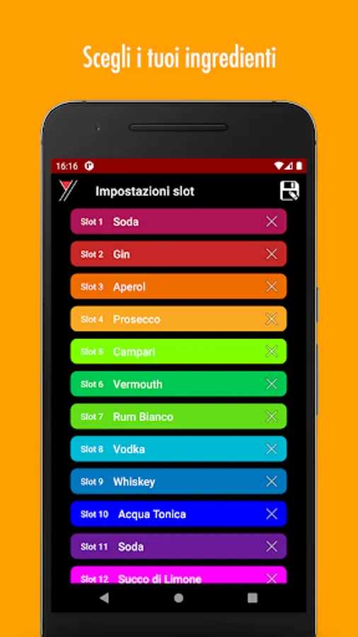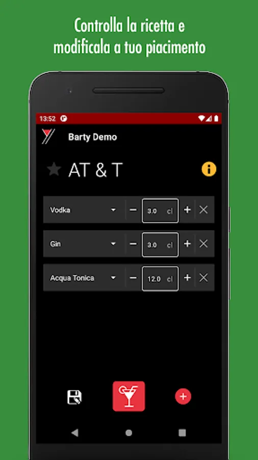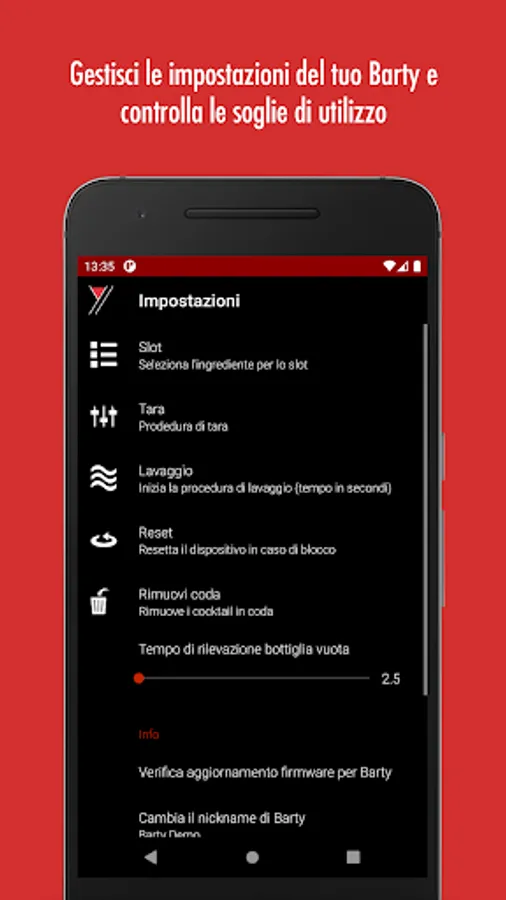 The app allows you to remotely control all the functions of the machine. It has a simple and intuitive interface to manage all of Barty's work: choose your drink from the available preparations, enter your personalized recipes, set your variants, manage work queues, check supplies and statistics. Through the app you can check the status of the machine and start the washing process.