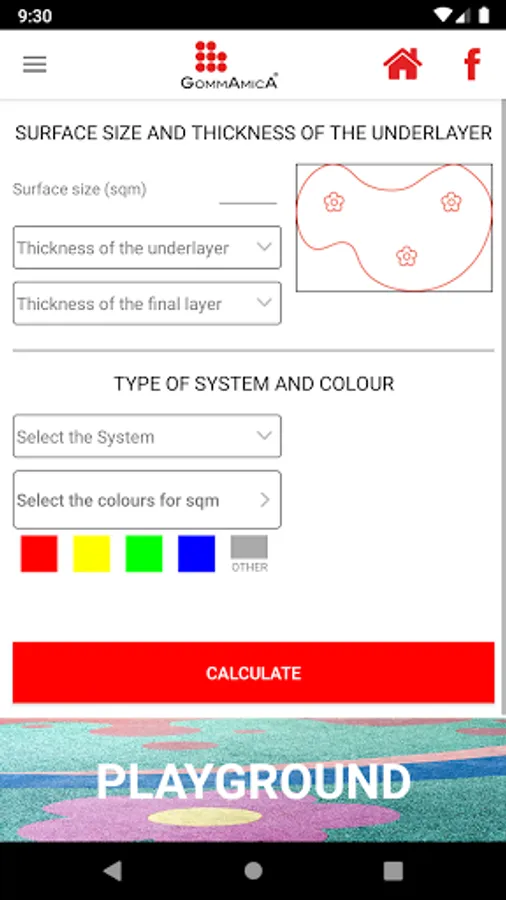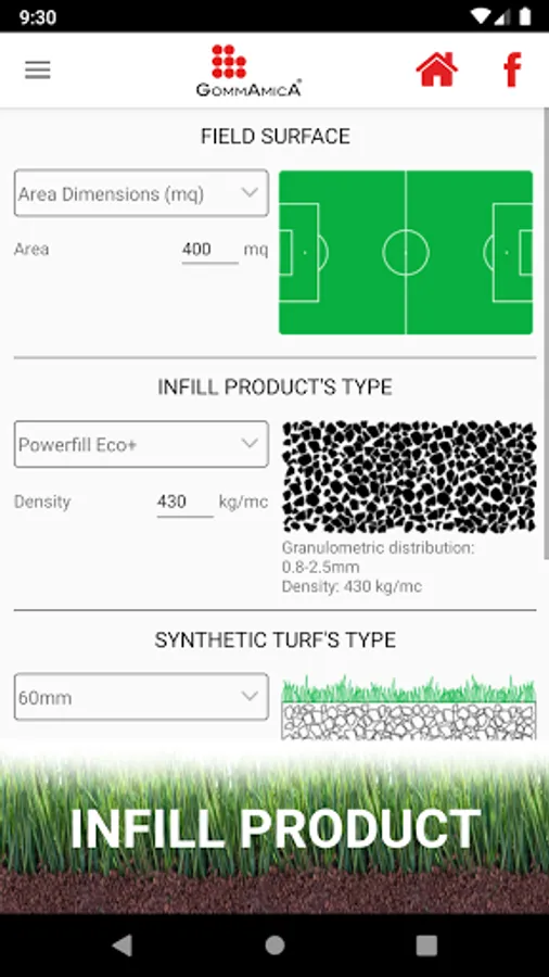 A modern application created to calculate with simplicity the right quantity of infill rubber granules that are necessary for the realization of synthetic turf fields and the exact amount rubber and binder for safety surfaces.