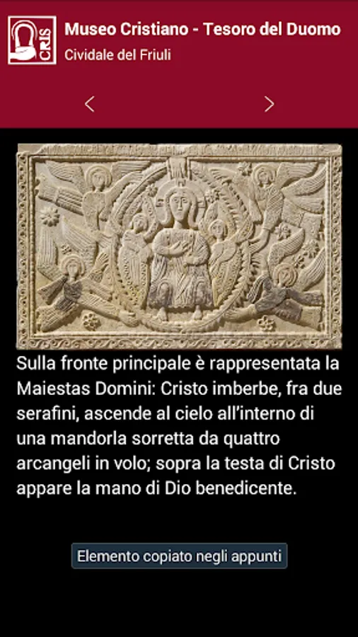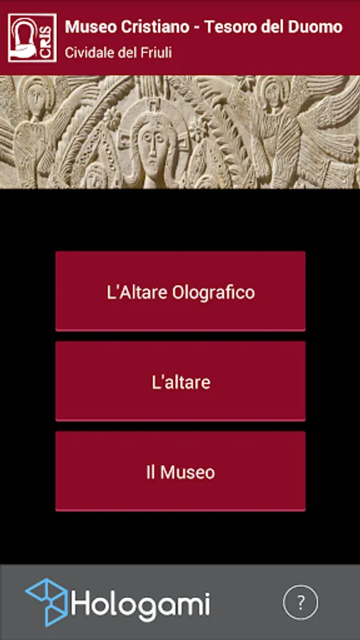 Hologami for the Christian Museum of Cividale - Treasure of the Cathedral is the official app of the Museum . Using the app , and a holographic pyramid Hologami (available at the museum ) you can see a holographic altar playing Ratchis in 3D . The app provides general information about the museum (links , schedules , contacts ) and a guided tour of the altar Ratchis .
