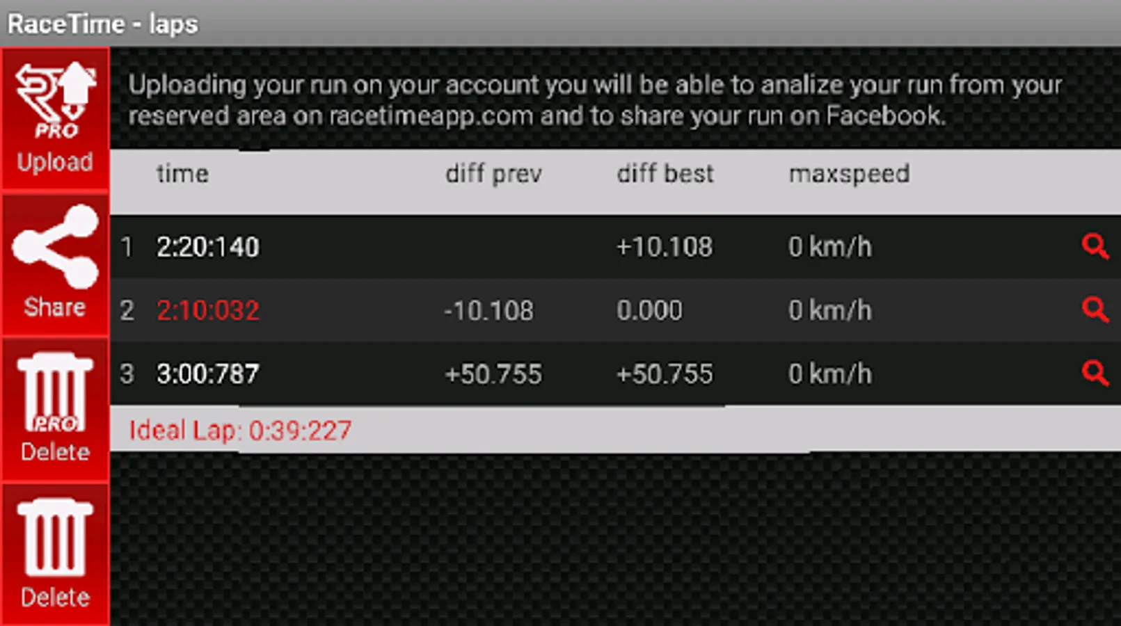 With Racetime PRO each run can be analyzed from the point of view of the trajectory on the track and the speed during the ride. Uploading the run on your PRO account you will be able to relive the laps in order to analyze every corner. Your PRO runs can also be shared on Facebook.