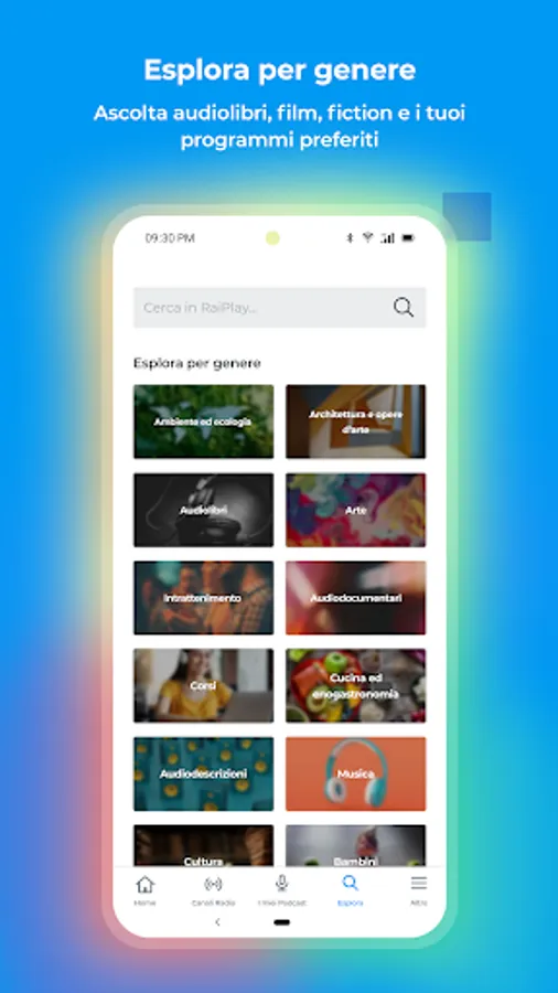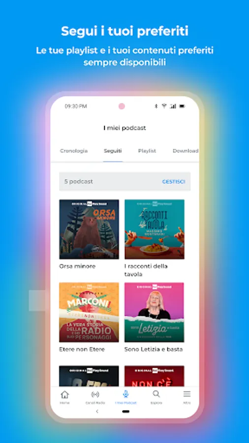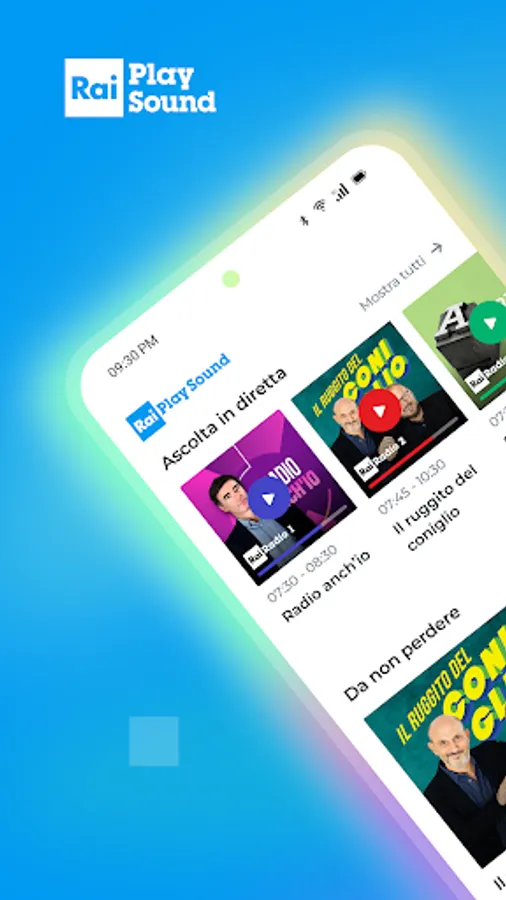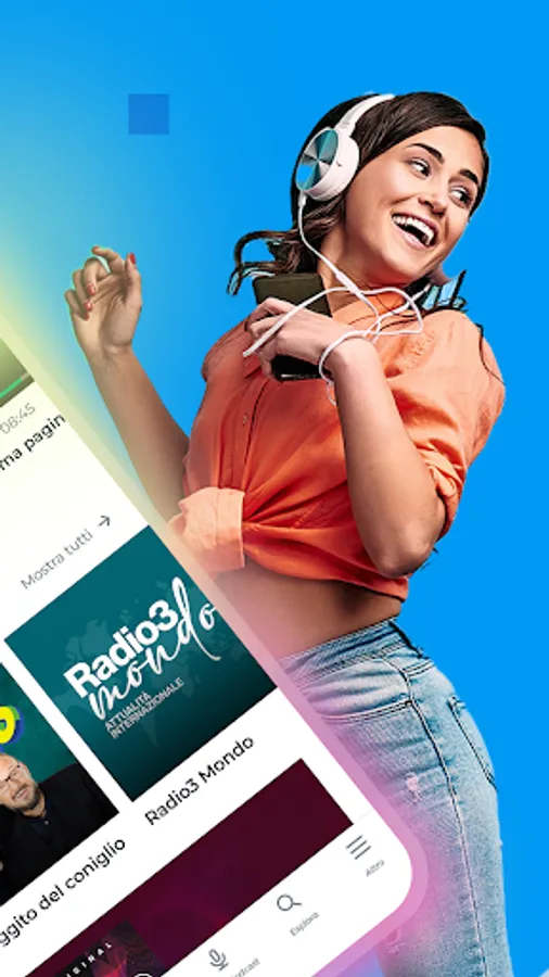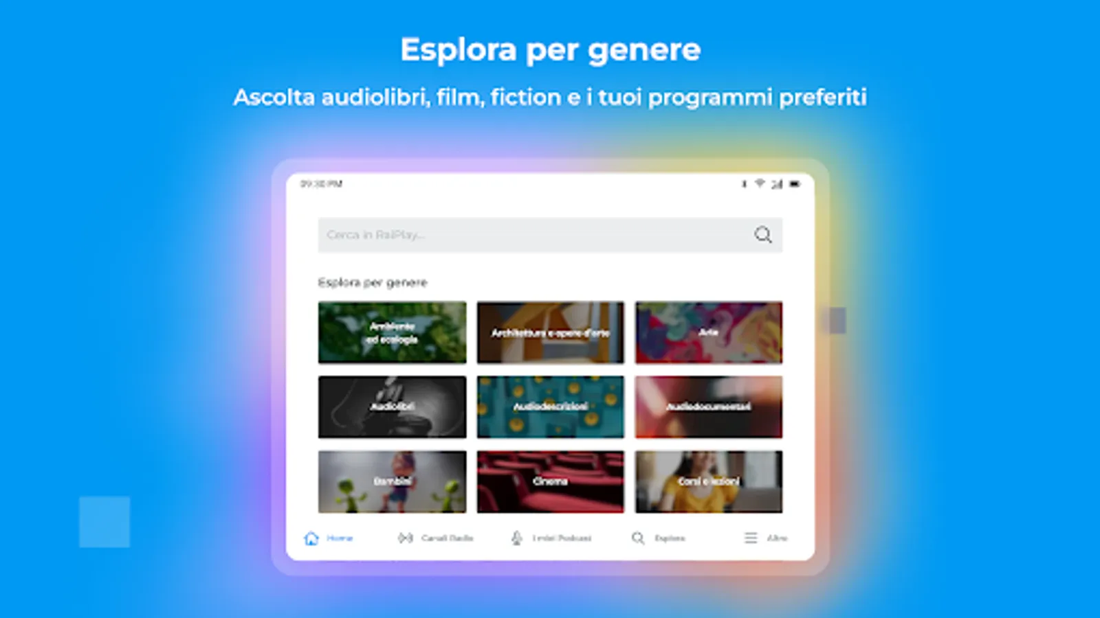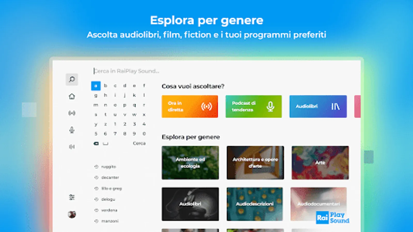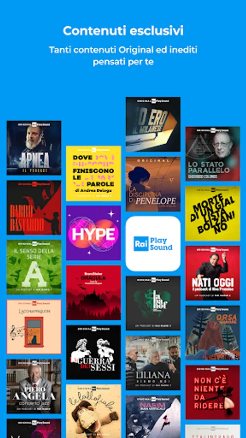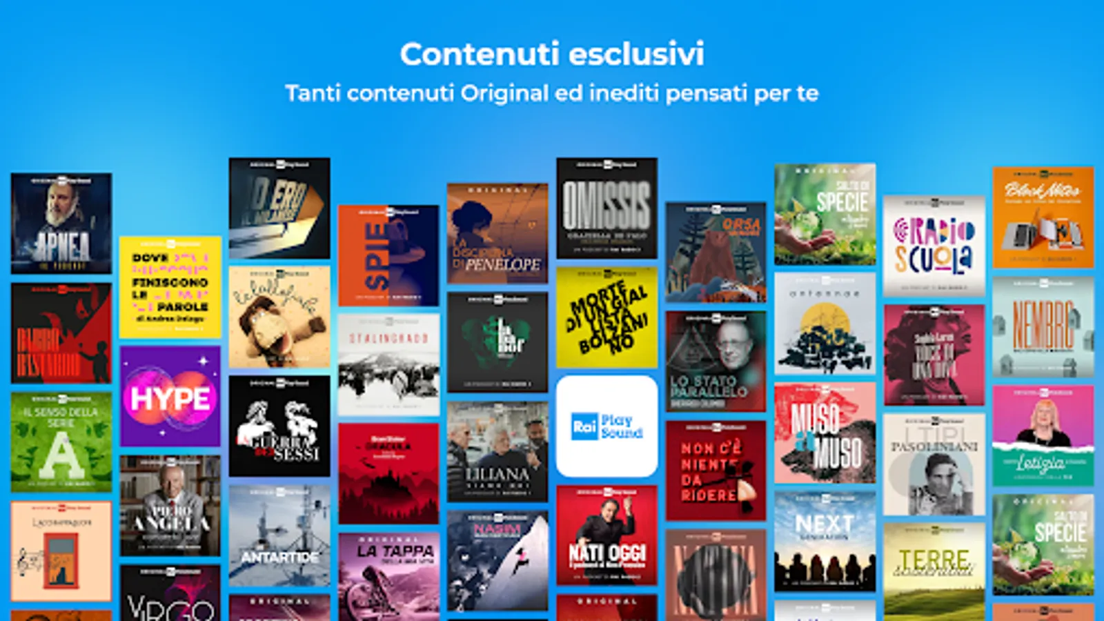 The homepage will allow you to discover the latest news available: from unmissable content to new audiobooks, from original podcasts to the latest editions of Radio Newspapers or the latest episodes and clips of your favorite radio programs. In addition, you will have quick and easy access to all categories of the RaiPlay Sound podcast catalog and live radio programs on Rai Radio channels.