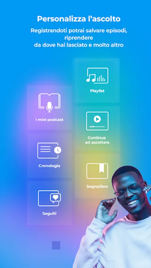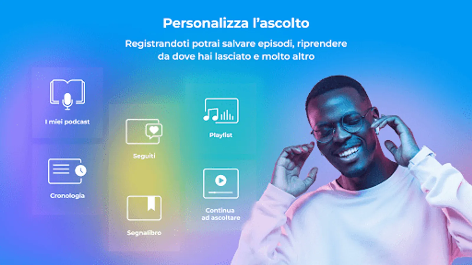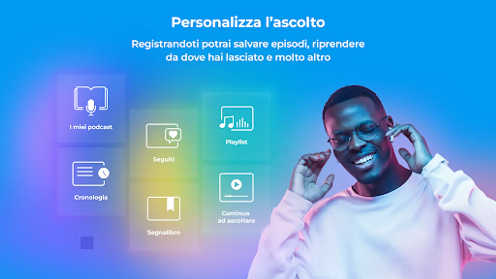 RaiPlay Sound is simple to use even on Smart TVs and it is not necessary to register to listen to the extensive catalog available. By registering and logging in with a free Rai account, you will also have the possibility to customize your listening experience on RaiPlay Sound, saving your "favorite" programs with the "Follow" function, accessing your playlists, your bookmarks and your listening history (to pick up where you left off).