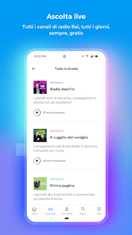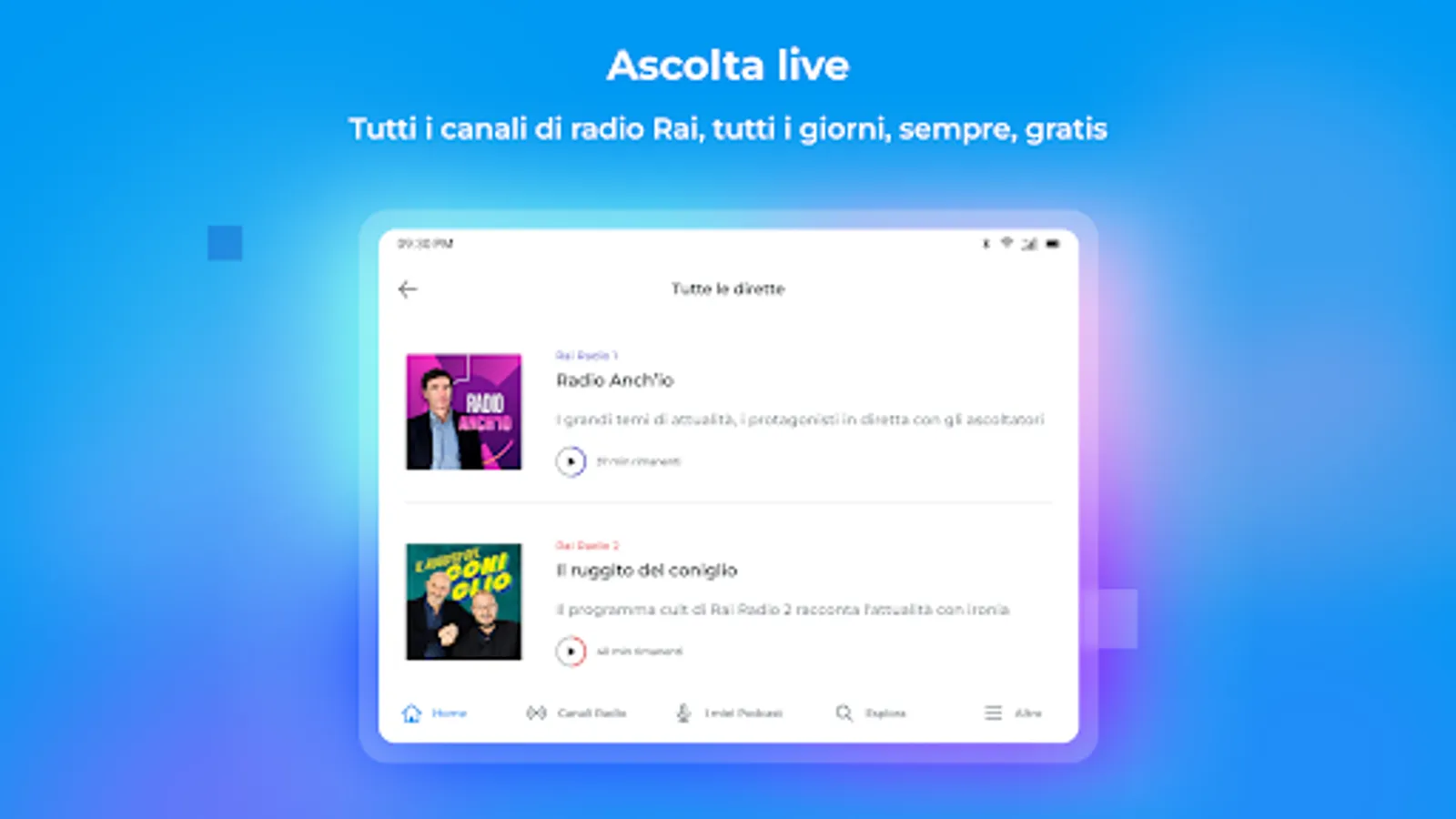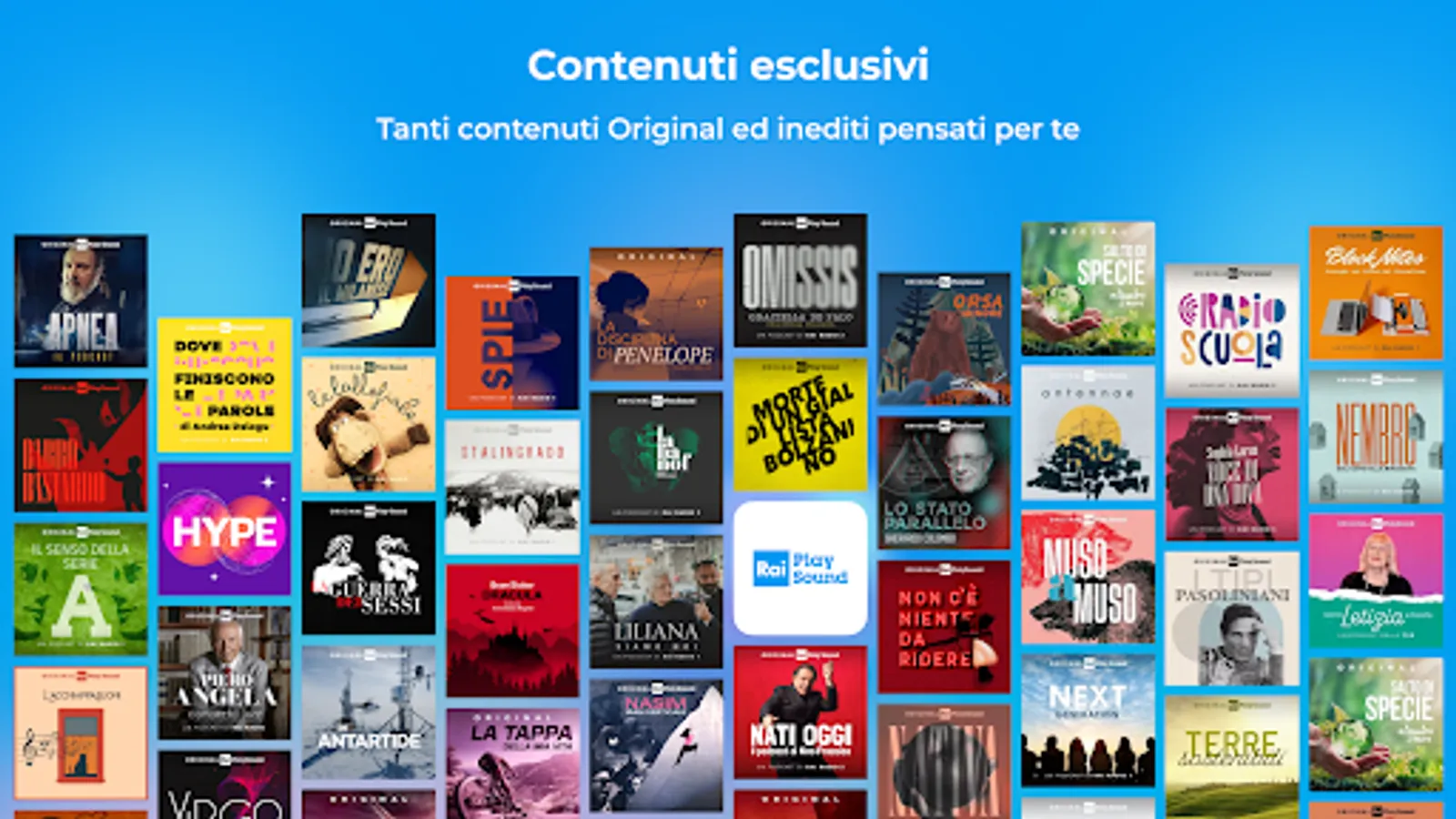 Listen to original and unpublished podcasts, audiobooks, radio programmes, films, TV series and audio-described cartoons, audio-only TV programs and stay up to date with the news of the Rai radio news (national and regional GR). Follow live on all Rai Radio channels and don't miss the most important live sporting events.