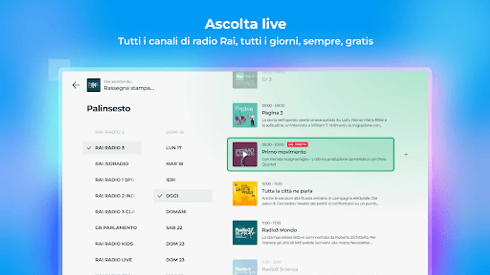 From the "Channels" section you can view the schedule and access the live streaming of Rai radio channels (Rai Radio 1, Rai Radio 2, Rai Radio 3, Isoradio, No Name Radio, Rai Radio 1 Sport, Rai Radio 3 Classica, Rai Gr Parlamento , Rai Radio Techetè, Rai Radio Kids, Rai Radio Live Napoli, Rai Radio Tutta Italiana, Rai Radio Trst A, Rai Radio Südtirol). By selecting a live channel you can also view the schedule of the day, that of the following week and listen to the episodes aired in the last seven days.