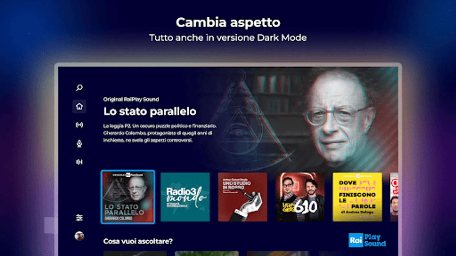 Discover the podcast and audiobook catalog and follow the Rai Radio channels live on RaiPlay Sound, the free Rai platform dedicated to streaming listening.