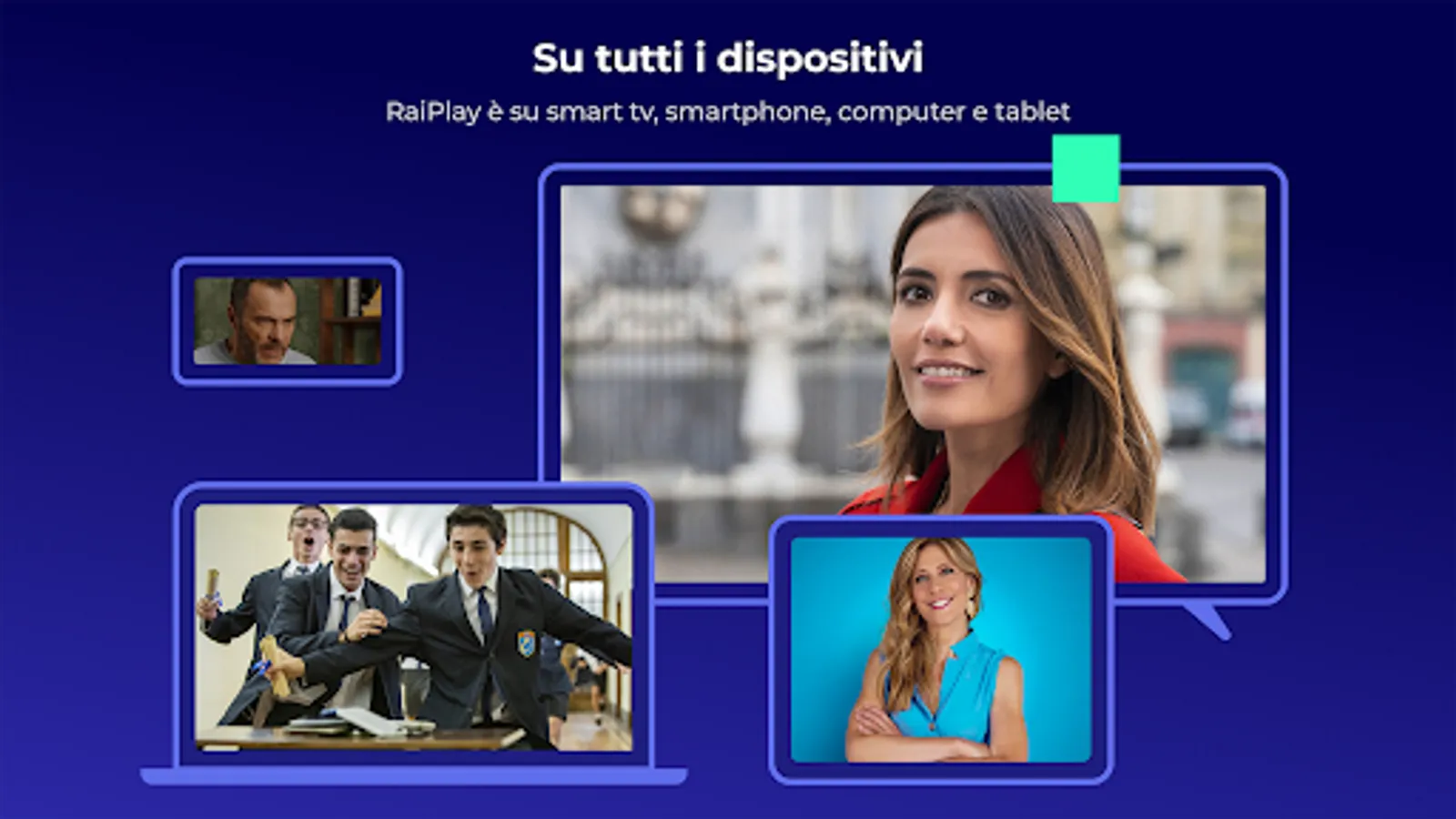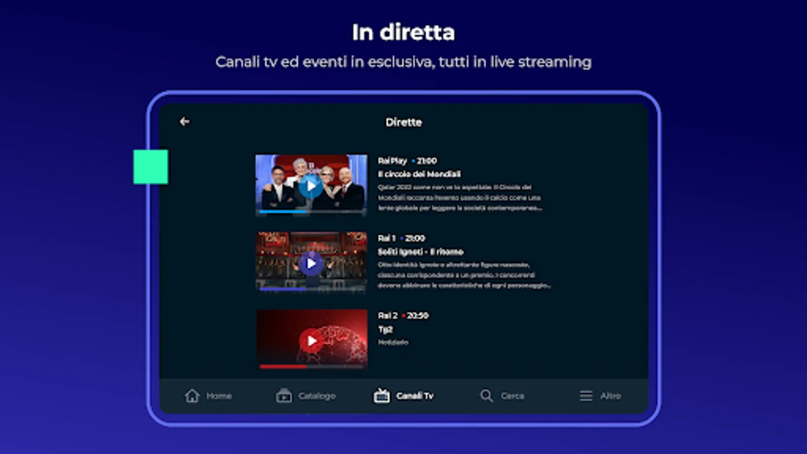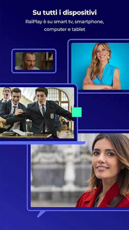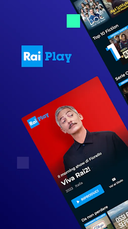 In the TV CHANNELS section you will have access to the DIRECT of 14 Rai TV channels (Rai1, Rai2, Rai3, Rai4, Rai5, RaiMovie, RaiPremium, RaiGulp, RaiYoyo, RaiStoria, RaiNews, RaiSport1, RaiSport2 and RaiScuola), to LIVE EXCLUSIVE content on RaiPlay channel and the TV / REPLAY GUIDE service to review programs broadcast on the last 7 days on demand and find out what the future programming of Rai networks offers.
