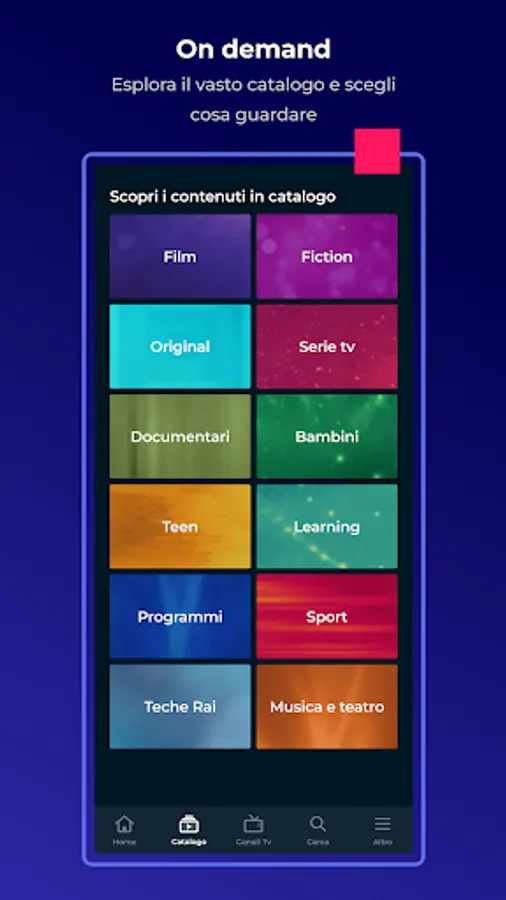 Discover the new RaiPlay app. In the ON DEMAND section, the rich and new catalog organized by types and genres: you can choose the content of your interest to watch whenever you want. Films, dramas, TV series, cultural, entertainment, in-depth programs, for children, documentaries, sports, opera, theater, music and selections from Teche Rai but also original formats designed for a younger audience.