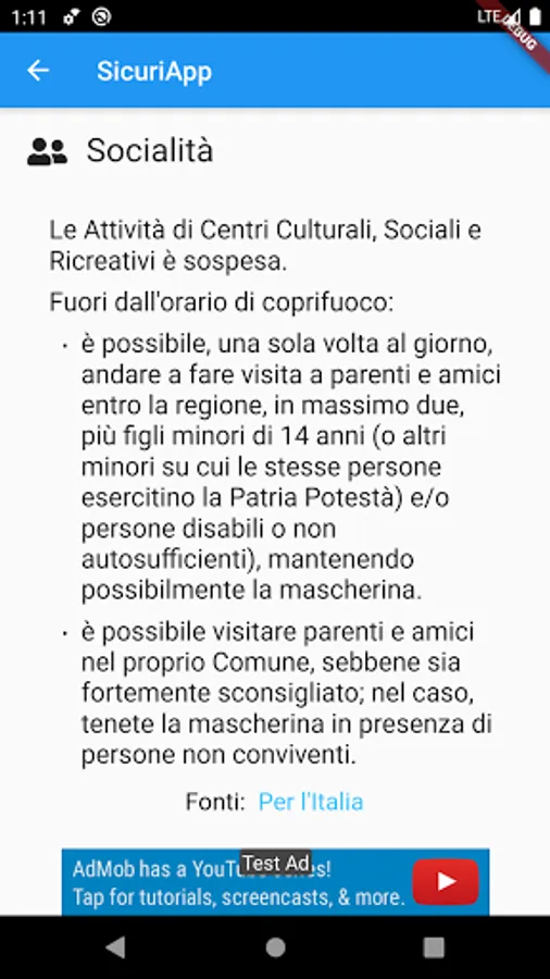 Safe Apps and the Safe Database from which it draws have been created voluntarily and free of charge by independent developers with the aim of simplifying the usability of the information that the Authorities already make available to citizens. The sources of each "card" are always indicated at the bottom of it (divided by country, region and city when these are combined) to allow users to deepen and verify the topic and then use Sicuri App as a reminder of behavior and rules imposed by the Authorities.