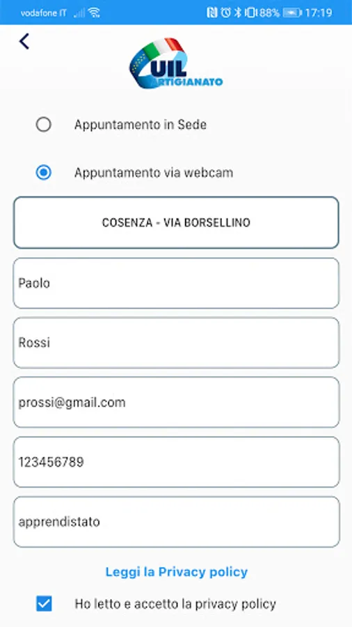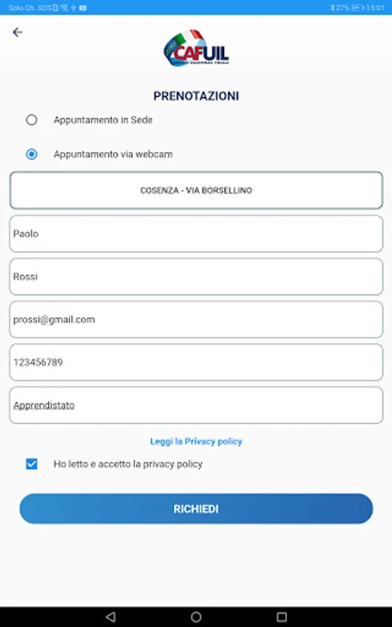 Appointment booking. The application features the functionality that allows citizens to book a live video chat session or a physical appointment in the offices of the selected UIL Calabria headquarters, quickly and easily.