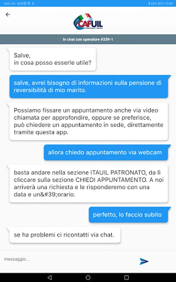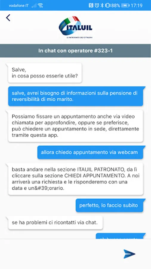 Chat support. With the UIL Calabria app, you can request free live chat assistance from our consultants, who specialize in various thematic areas. The service is designed to facilitate workers and retirees, offering them the opportunity to accelerate the acquisition of the desired information.