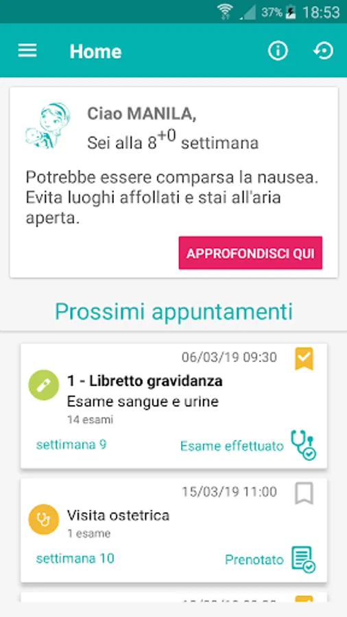 hAPPyMamma allows you to have the personalized transposition in the app agenda of the pregnancy booklet and the vaccination calendar of your child, with reminder mechanisms.