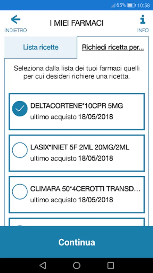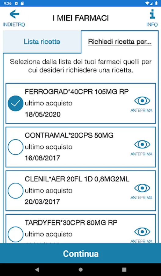 As you purchase the drugs, an archive is created within the app from which you can directly forward to the doctor, according to the methods and channels agreed with him, the request for renewal of a prescription.