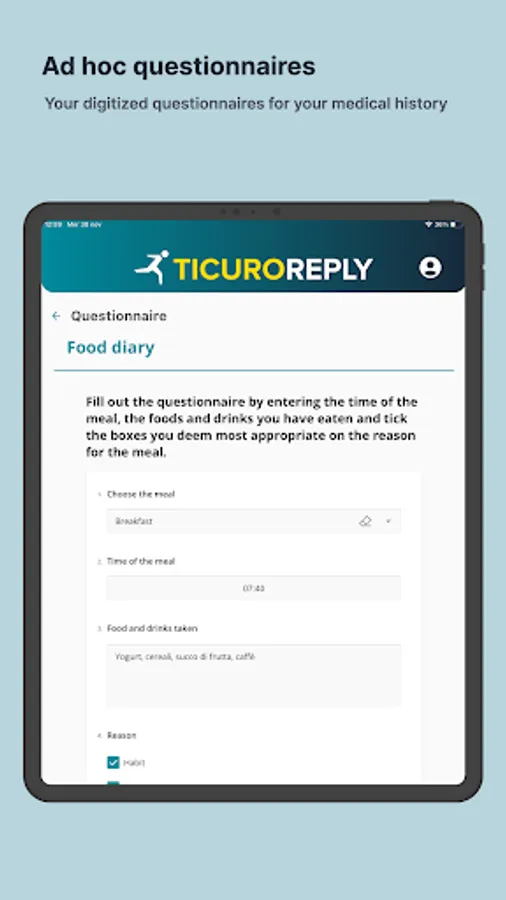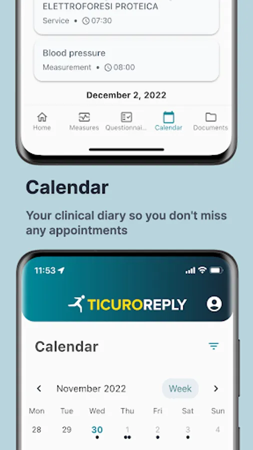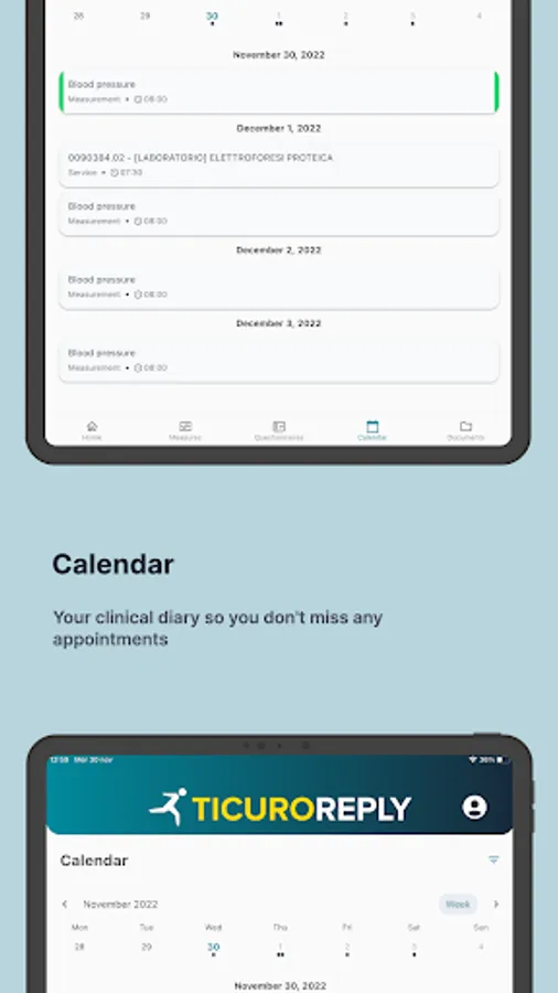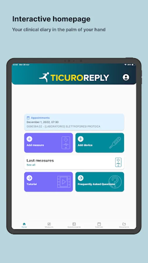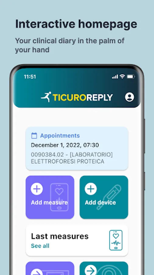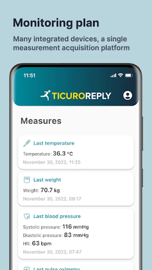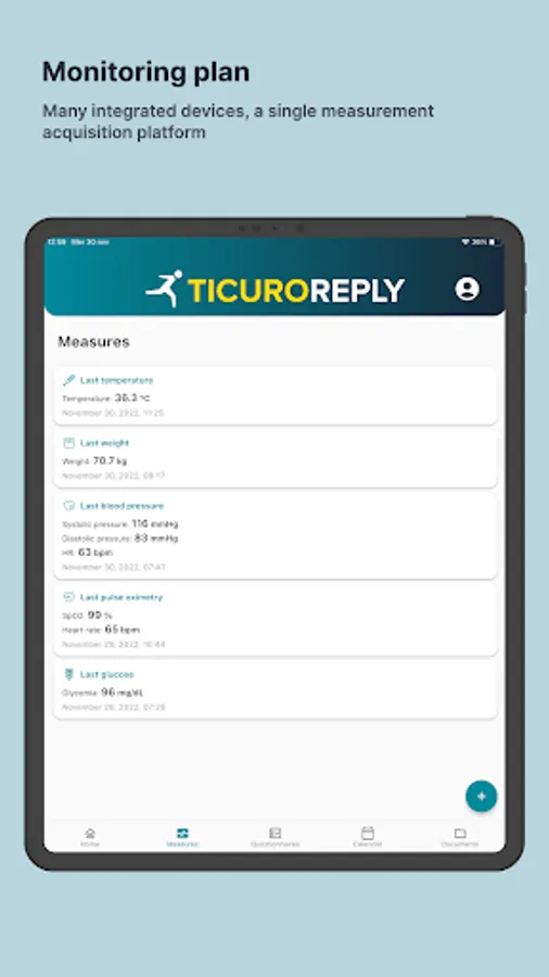 Ticuro Reply is an innovative telemedicine app that breaks down geographic and time barriers, reducing waiting time, hospital load, and travel costs. The service offers telemonitoring, televisit, teleconsultation, and telereferral modules which, together with the integration with numerous medical devices, allows the simple and immediate acquisition of the essential vital parameters for the continuous monitoring of the patient.