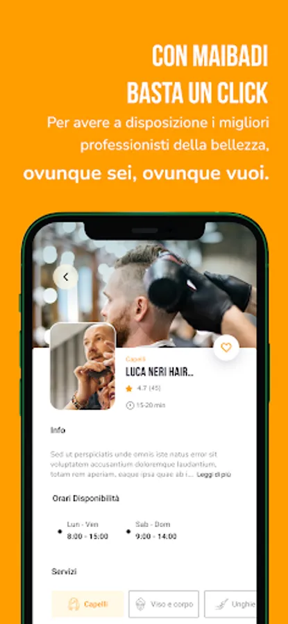 Download MAIBADI and with a simple click you can book beauty and wellness services at home in a fast and innovative way. The customer has the possibility to view the professionals available in his city, select the day/time and book his preferred service in comfort directly at home or in the indicated place. Just Click & Relax!