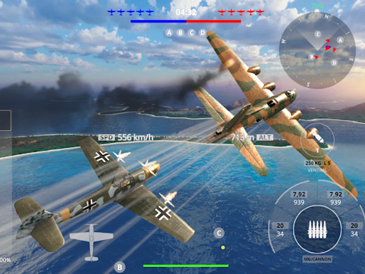 Fly your airplane and fight in 5v5 WW2 air combat! Being a pilot of a bomber or dogfight isn’t a piece of cake. You have to remember - these WW2 planes aren’t like a modern jet! Fly with your squadron and defend their warplanes. Use your flight simulator skills and watch the surroundings. In Wings of Heroes, sky battle is something more than sky combat in other flight and airplane games. Complete diverse sky combat missions and use the power of your WW2 planes!