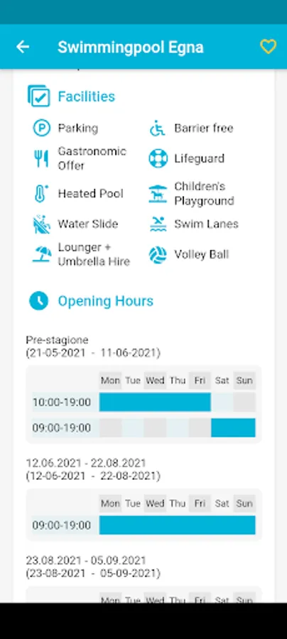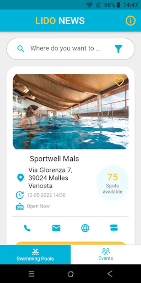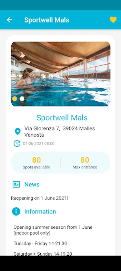 The app will list all the swimming pools with detail and real time information of some of them of the region Trentino South Tyrol and show you according to your position and the selected filters the most appropriate Swimmingpool around you.