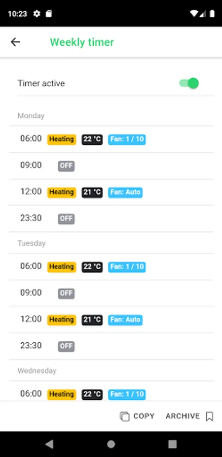 • Programming the set temperature and operating mode by choosing up to 6 actions per day for 7 days; all displayed in an intuitive layout