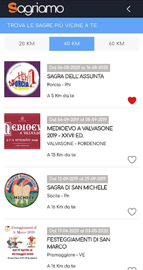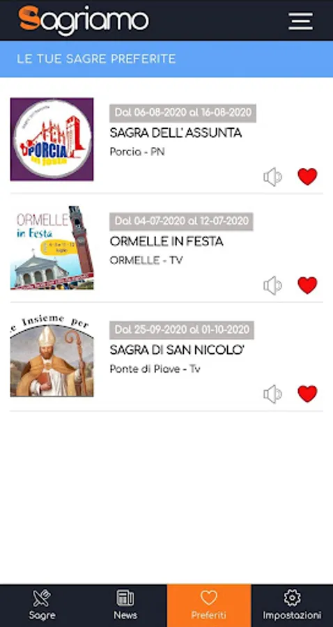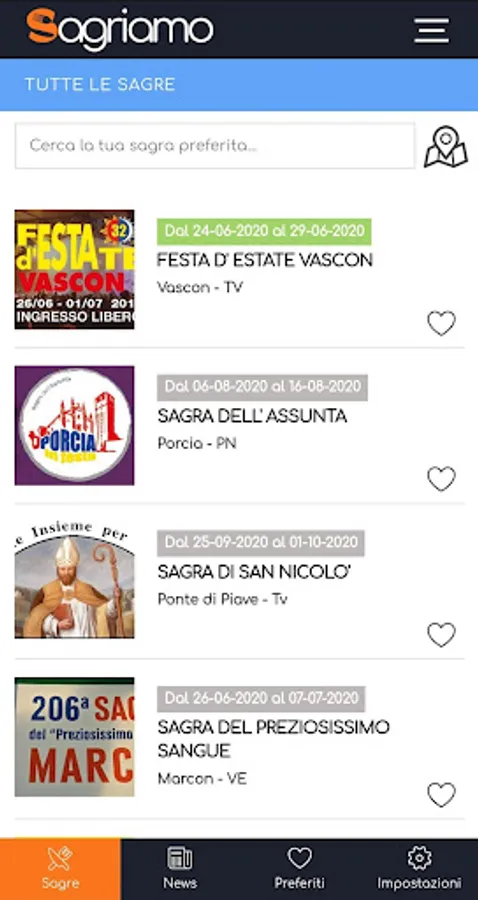 Sagriamo is the app that allows you to find all the festivals or village festivals closest to you. By accessing the card of a festival, you can consult the detailed program of the event and the services offered, as well as stay updated on all the initiatives published in the news section by the organizers. With the app you can also organize your festivals by adding them to your favorites and receive a notification every time an organizer publishes a new news. Thanks also to the "order online" service, you can send your order directly from the app, thus avoiding queuing at the cash desk. With Sagriamo you can also book your table at the festival by sending a reservation request directly to the organizers of the festival.