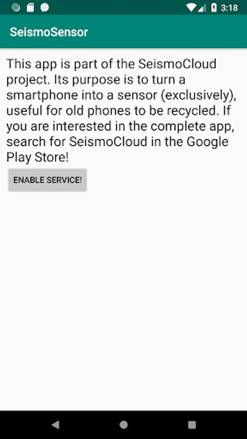 This app is part of the SeismoCloud project. Its purpose is to turn a smartphone into a sensor (exclusively), useful for old phones to be recycled. If you are interested in the complete app, search for "SeismoCloud" in the Google Play Store!