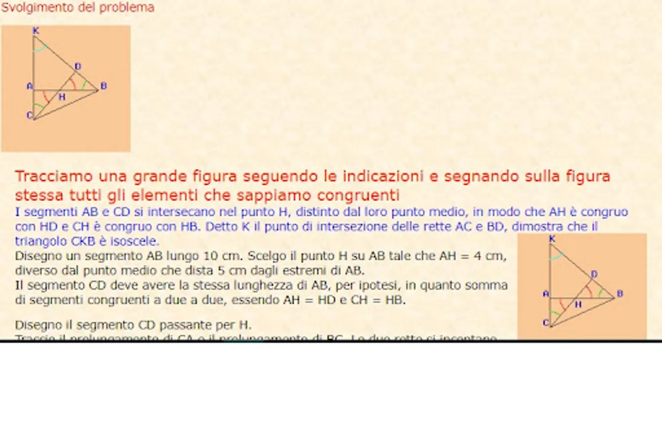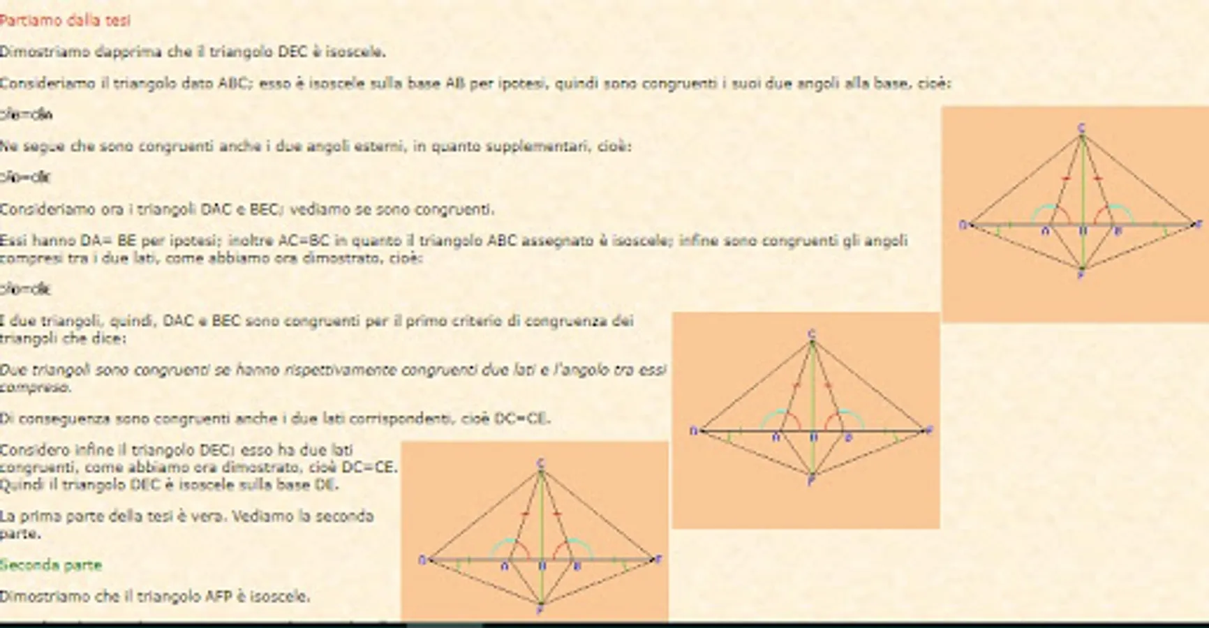 Data una traccia in lingua italiana di un problema di geometria, per scuola superiore, con dimostrazioni geometriche e senza misure di grandezze, trova una soluzione al problema disegnando la traccia, facendo i prolungamenti richiesti, e scrivendo la dimostrazione geometrica.
