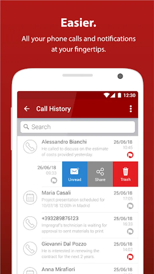 • Receive call notes immediately on your phone and organise them on the Call History.