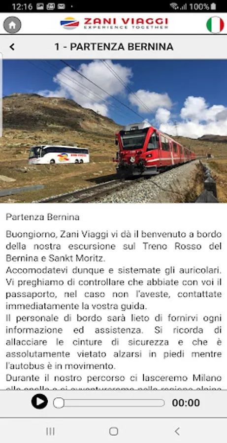 This App was designed to allow you to fully enjoy the tours of Zani Viaggi in your native language. The App will allow you to listen to a commentary dedicated to your tour without missing any details.