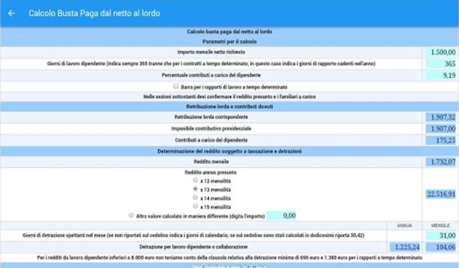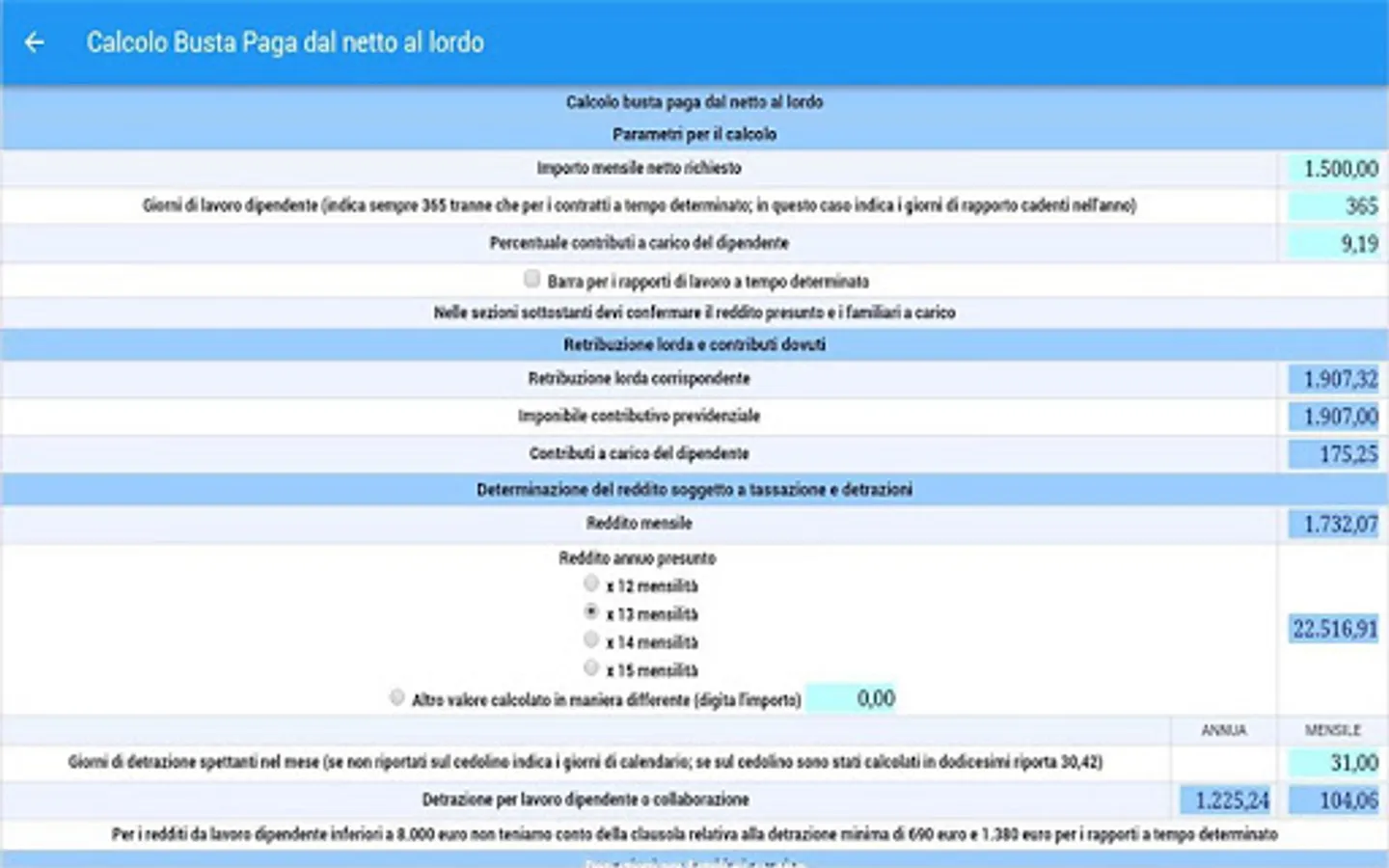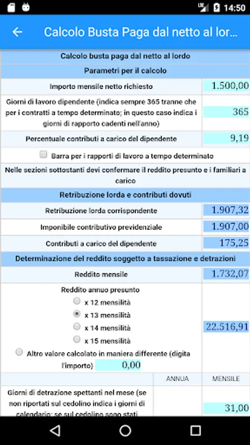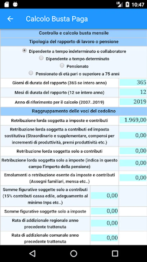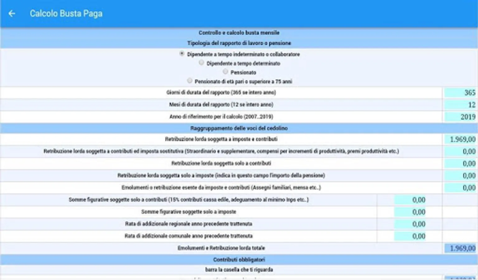 • CONTROL AND PAY ENVELOPE CALCULATION: Allows you to check the calculations for paychecks (or retirement) monthly and in particular the contributions and taxes owed by the insertion of gross earnings and other items subject and not subject to taxes and contributions ;