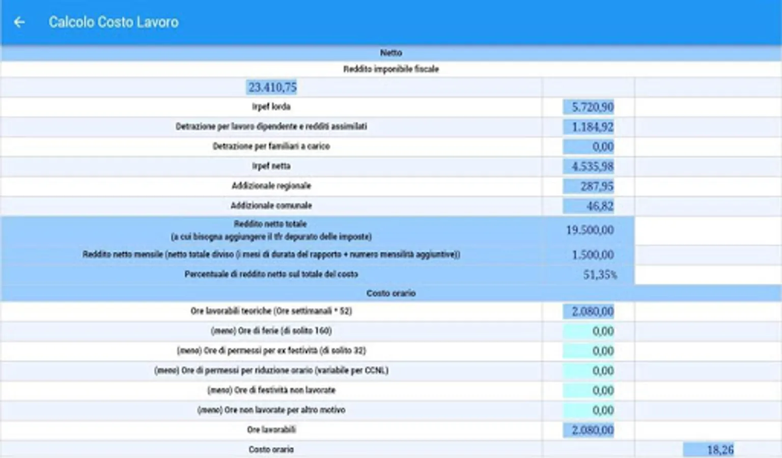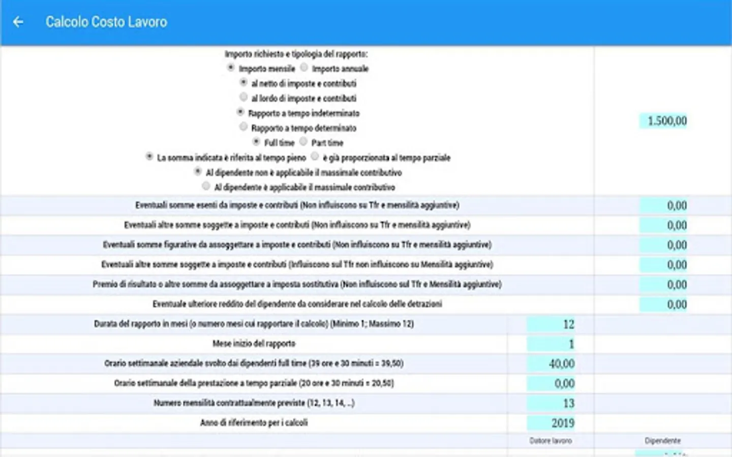 • EMPLOYEES COST CALCULATION: Determine the company's cost of para-subordinate work (collaborators and associates in participation) based on user-entered data, ie the gross or net (monthly or yearly), the type and duration of the relationship and the family burden of the employee.