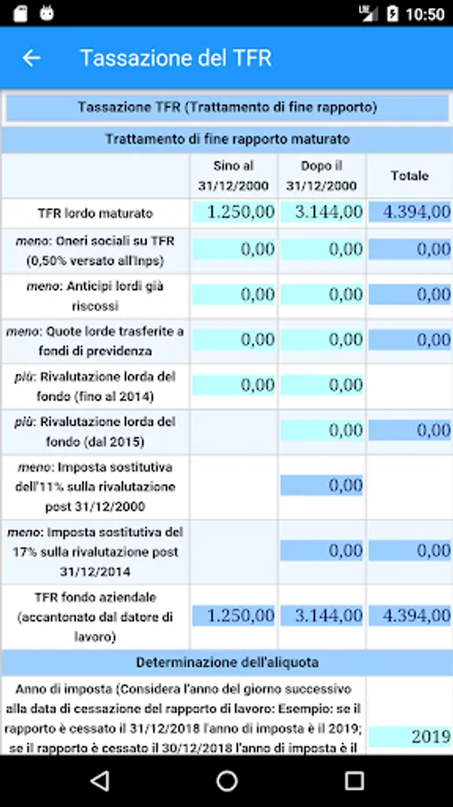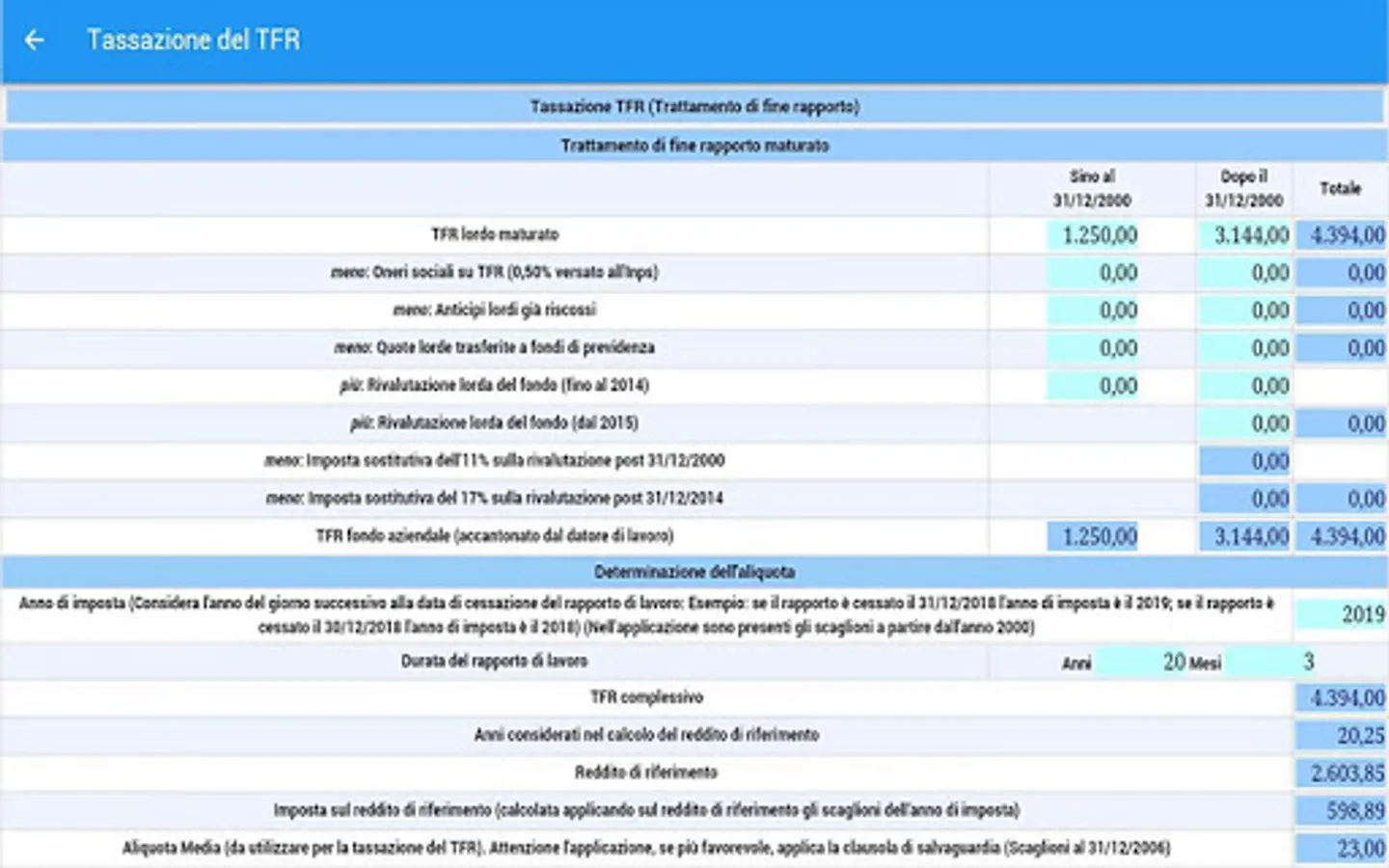 • TFR TAXATION: Allows for the determination of the tax due on severance pay both on the portion accrued up to 31/12/2000 and on that accrued subsequently;