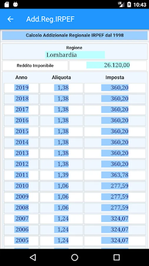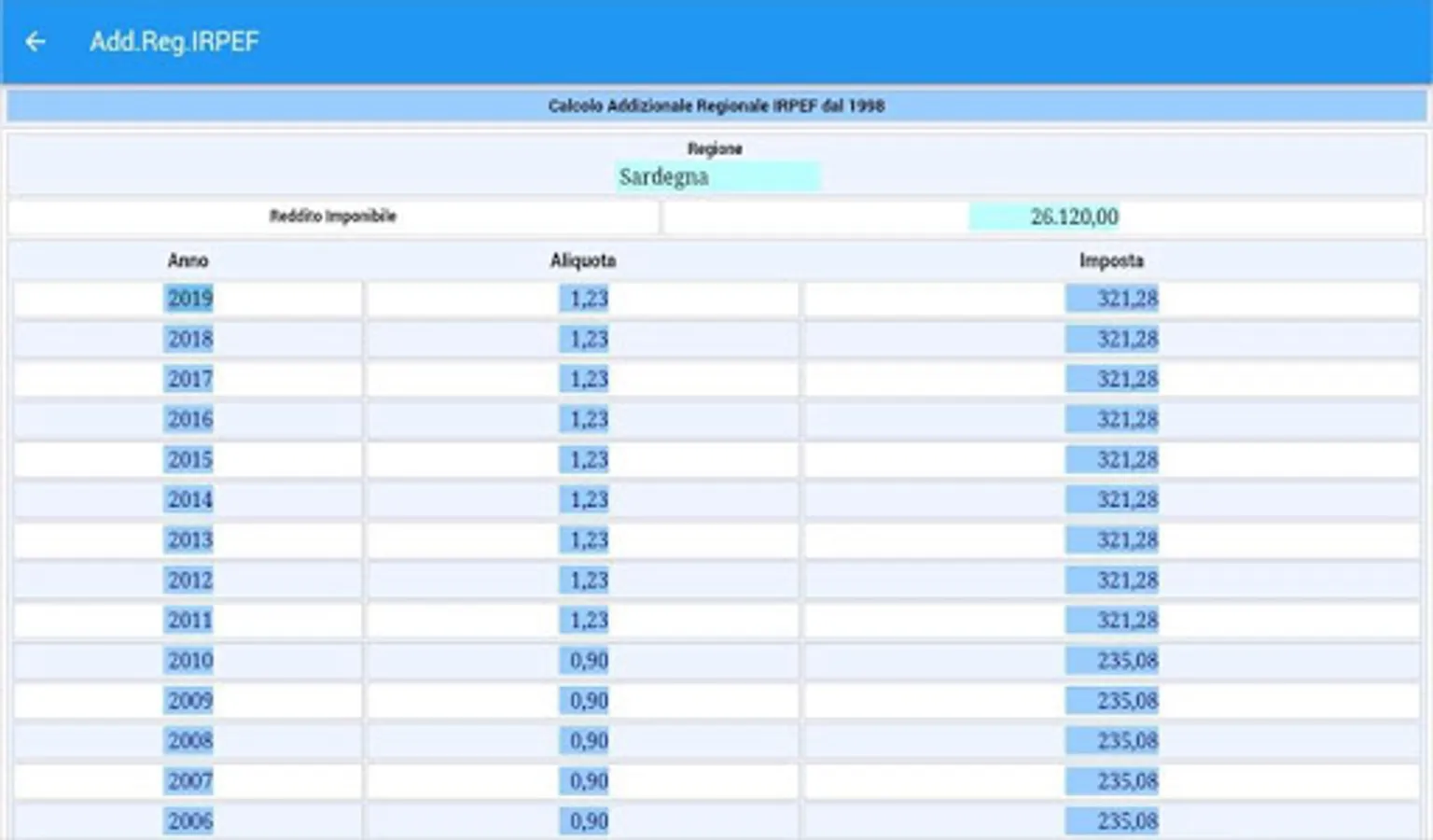 • REGIONAL ADDITIONAL CALCULATION: It shows the calculation of the regional IRPEF surtax on a specific income based on the rates from 1998 to 2023.