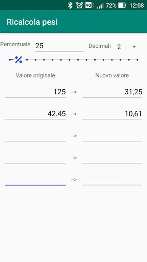 By indicating a series of values (weight, length, etc.) and setting a percentage, all the recalculated values will be shown.
