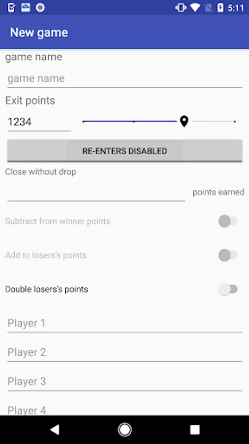 From the main screen you can create the matches by defining the name, the exit score by selecting among the standard ones or by defining them as personalized, indicate whether the re-enters or not and the names of the various players are expected.